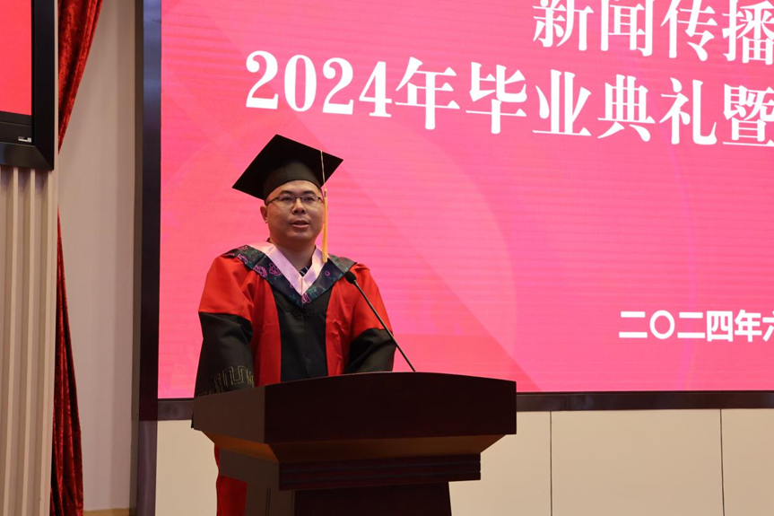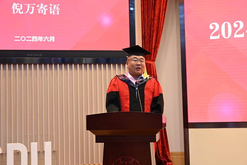 学院副院长(主持工作)倪万向毕业生寄语。倪万强调,同学们在学院的几年中不仅学习到了知识,更在品德修养和创新能力上取得了全面进步。他特别感谢了家长和老师们的辛勤付出,并鼓励毕业生们在未来的人生道路上,以自我革新、拥抱变化的态度,迎接每一个新挑战。倪院长还向毕业生们提出了三点期望:一是自我革新,拥抱变化;二是保持真诚与善良之心;三是坚定理想信念,不忘初心,不负热爱。最后,倪院长代表学院表达了对毕业生们未来的美好祝愿,并表示山东大学新闻传播学院永远是他们的避风港。