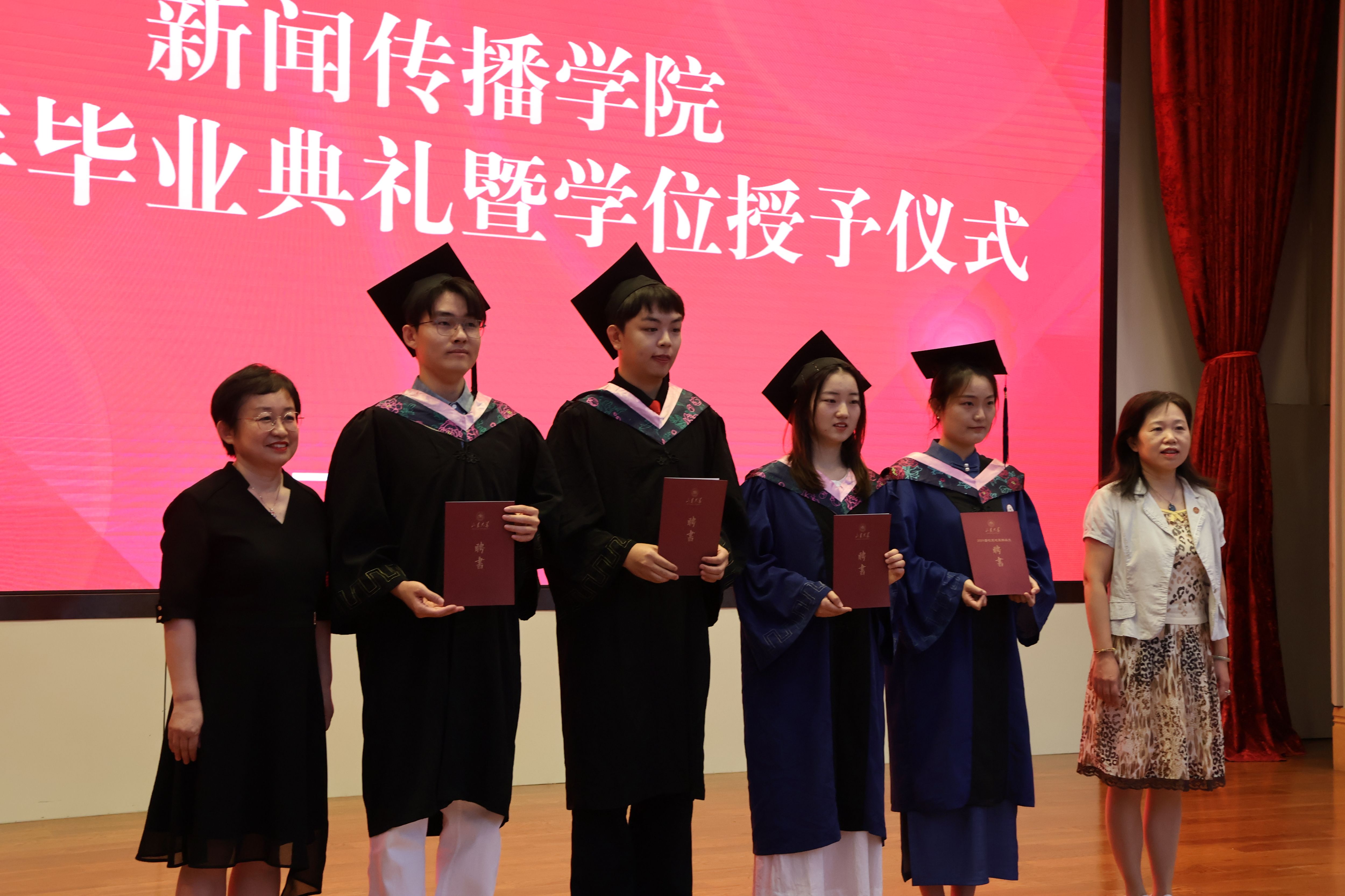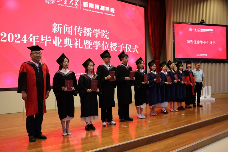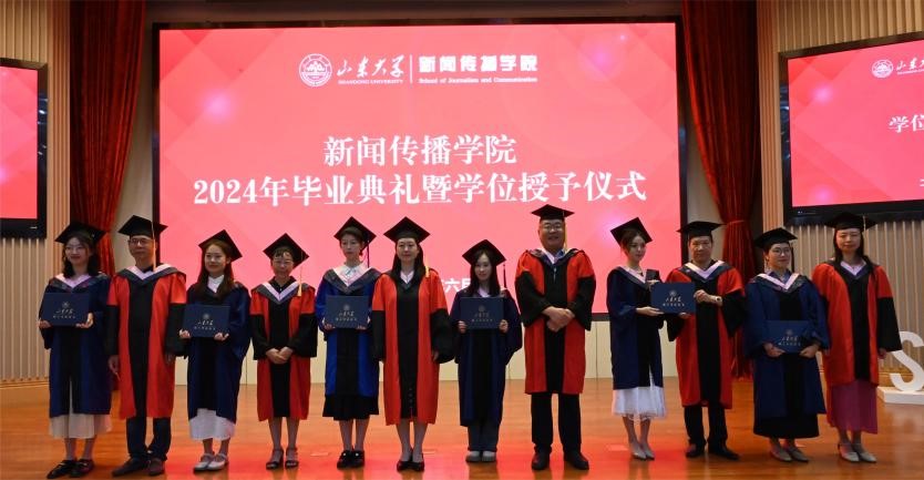 6月20日上午,山东大学新闻传播学院“乘新风,赴山海”2024年毕业典礼暨学位授予仪式在山东大学中心校区知新楼A座3层报告厅隆重举行。新闻传播学院党委书记孙宜山、副院长(主持工作)倪万、副书记王丽君、副处级组织员王智洁、院长助理于智源、孙晓翠、新闻传播学院学位评定分委员会的专家、专业教师、毕业班辅导员、班主任和全体毕业生参加典礼。典礼由副院长邱凌主持。