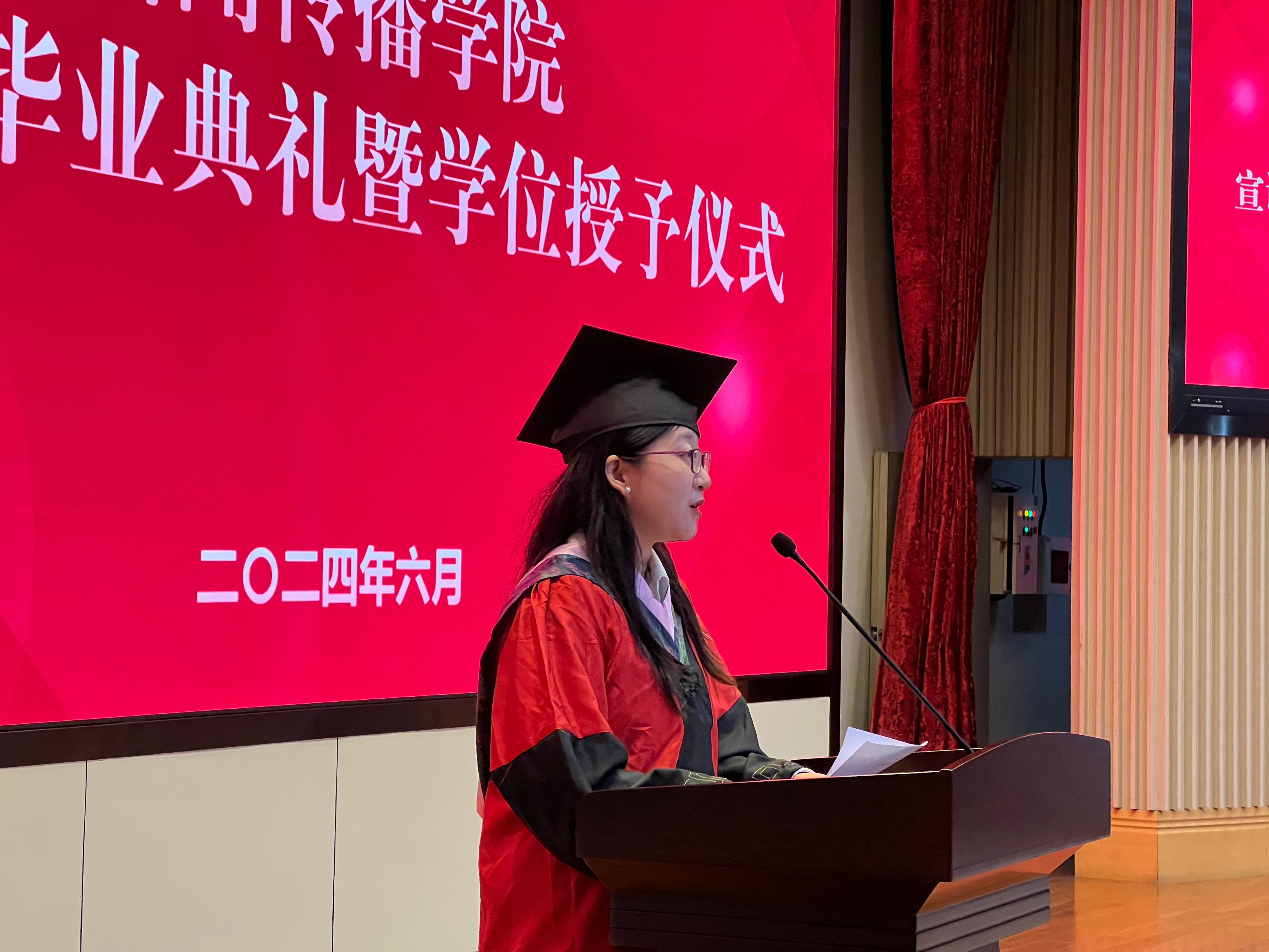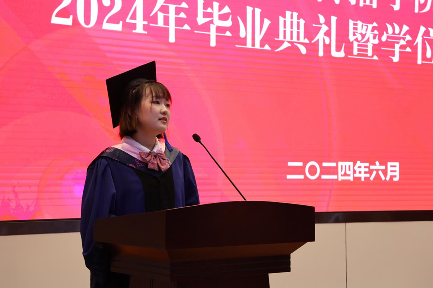 接下来,毕业生代表上台发言。2020级本科一班周傲珺回顾了四年大学生活的难忘时刻,表达了对新传学科的热爱和对学院的感激。周傲珺鼓励同学们勇敢追求梦想,将校训精神融入未来生活,祝愿大家前程似锦。