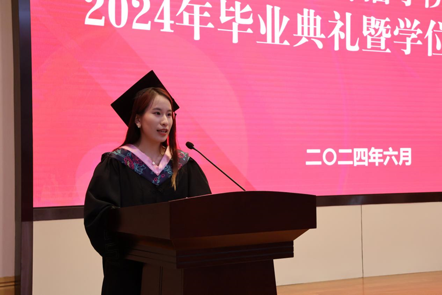2021级硕士研究生刘晨曦回顾了硕士生涯的共同回忆与成长。她感谢了学院的培养和师长的教诲,强调了新时代青年的社会担当和学术训练的重要性。刘晨曦代表毕业生向学院赠送绿植,寓意学院人才辈出,祝愿大家未来重逢时以欢乐和笑容相迎,毕业快乐。