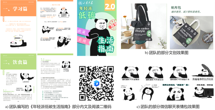 根据调研结果和产品一期反馈,团队修订了《年轻派低碳生活指南》,对旧版本的不足之处进行改进的同时新增了职场办公低碳指南;团队还开发了一系列文创产品,包括帆布袋、鼠标垫、平板电脑保护壳等,进一步推广双碳理念,这些产品均采用环保材料制作,设计风格贴近年轻人口味,旨在以生活点滴倡导绿色行为。