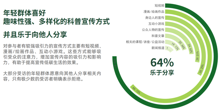 值得注意的是,大部分青年愿意主动分享低碳生活相关的内容,表明他们具有较高的传播意愿。通过打造有趣、富有互动性的“爆款”宣传品,并利用社交媒体的互动转发机制,可以有效激发青年的自主传播动力,进一步扩大低碳生活理念的影响力。在具体实践中,“混知”的科普漫画、B站用户上传的节能减排视频、动画《环保剑》以及阿里巴巴集团的跨界融合项目等,均展示了生动有趣的传播方式在低碳科普中的重要作用。特别是跨界融合模式,通过不同行业的联动与互动,不仅增强了科普的趣味性,还实现了经济效益与环保效益的双赢。
