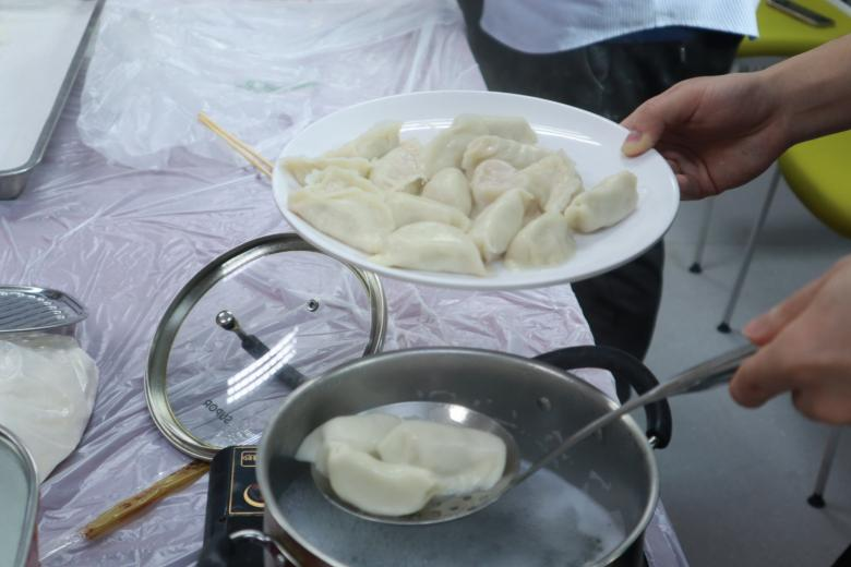 活动伊始,齐园餐厅的张老师和郭老师进行了生动细致的包饺子示范,将包饺子的诀窍倾囊相授。在领悟要领后,老师同学们纷纷跃跃欲试,领取面团、馅料及工具,积极参与,有的分割面团,有的擀饺子皮,有的包饺子,分工明确,默契配合。