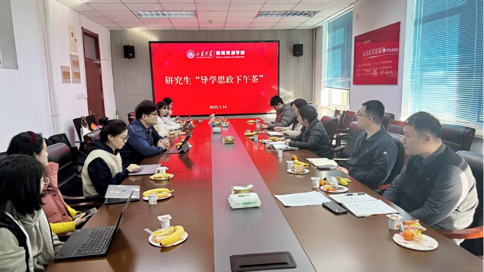 1月14日下午,新闻传播学院举办了研究生“导学思政”下午茶活动。学院党委副书记王丽君、副处级组织员王智洁、院长助理于智源、研究生教务秘书韩恺、团委副书记(主持工作)张忠潮、学院权益委员会负责人、博士生和硕士生代表参加了此次活动,活动由王丽君主持。