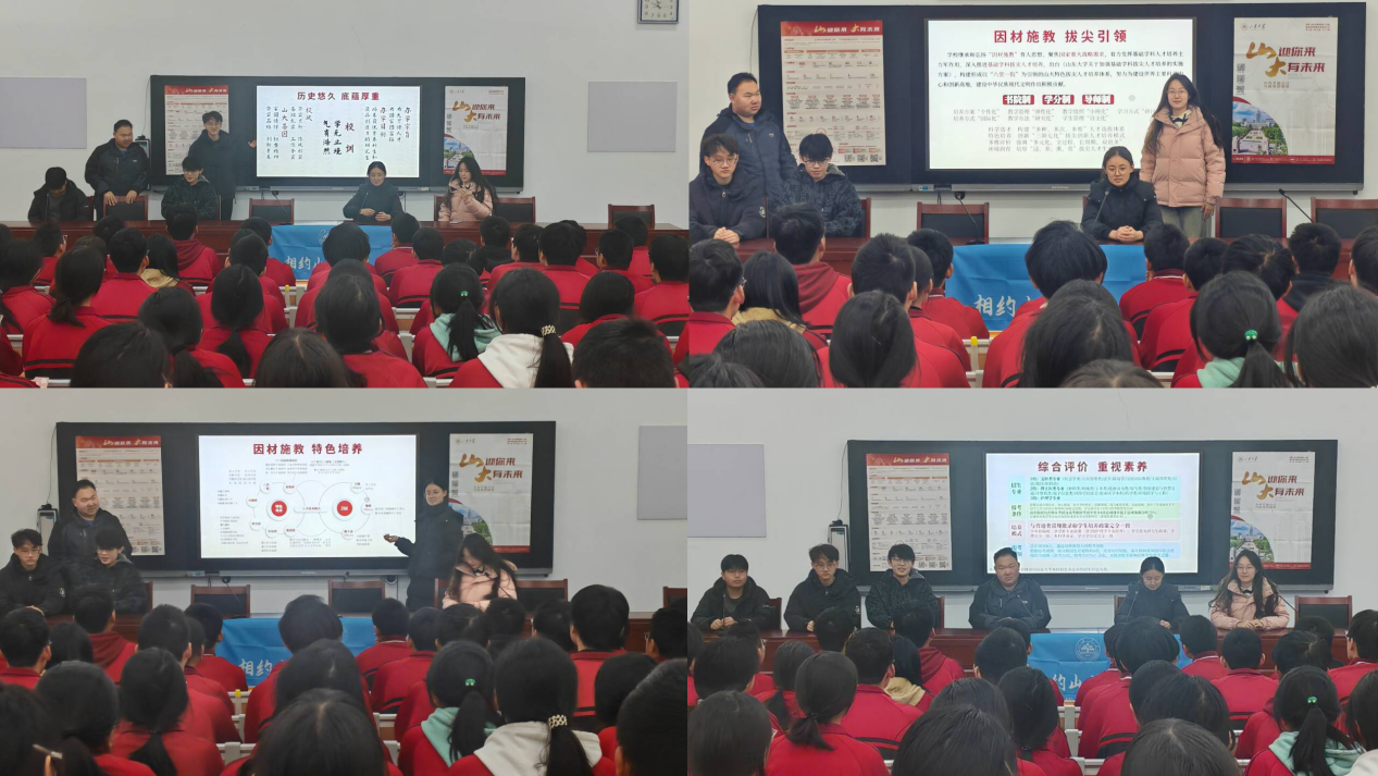 1月21日,新闻传播学院“沂起来山大”母校回访宣讲团(山东省080队)联合山东省217队、山东省269队等在山东省沂南第一中学阶梯教室进行宣讲活动。宣讲由山东省080队队长尹天佑主持,山东省080队成员尹天佑、吴中豪,山东省217队队长李卓,山东省269队队长李依轩主讲,来自线上线下不同渠道的500余名学生参加了宣讲活动,数名高三班主任及任课教师旁听。宣讲团讲解了山东大学的历史沿革、学科特长、人才培养、校园生活、招生政策等,并播放了山东大学招生宣传片、百团大战剪影等视频,全方位、多角度地介绍了山东大学。宣讲团成员还结合个人学习生活,介绍了山东大学的生活条件和校园文化。宣讲最后环节,山东省080队成员李芸旭、威海校区宣讲队成员薄晓雨补充介绍了青岛校区和威海校区,此外宣讲团成员还解答了学弟学妹关于山东大学、大学生活和高考复习的相关问题,并为线下参会的同学们派发小礼品。