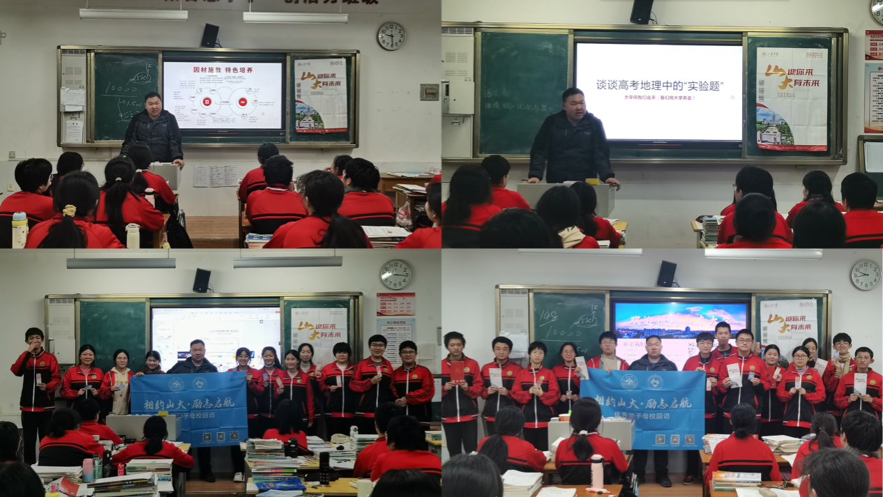 1月20日,“沂起来山大”母校回访宣讲团队长尹天佑在山东省沂南第一中学面向两个班级展开宣讲。他介绍了山东大学的学科特长和人才培养体系,着重讲解了山东大学的招生政策和报考需求,并结合自身报考经历详细阐释了强基计划、综合评价、高校专项等特殊类型的招生政策。此外,尹天佑还结合自身高考备考心得和学科研究,进行了有关备考方法和高考地理“实验题”的讲座报告,向学弟学妹们分享个人经验。宣讲结束后,尹天佑向学生们发放了山东大学的文创纪念品。
