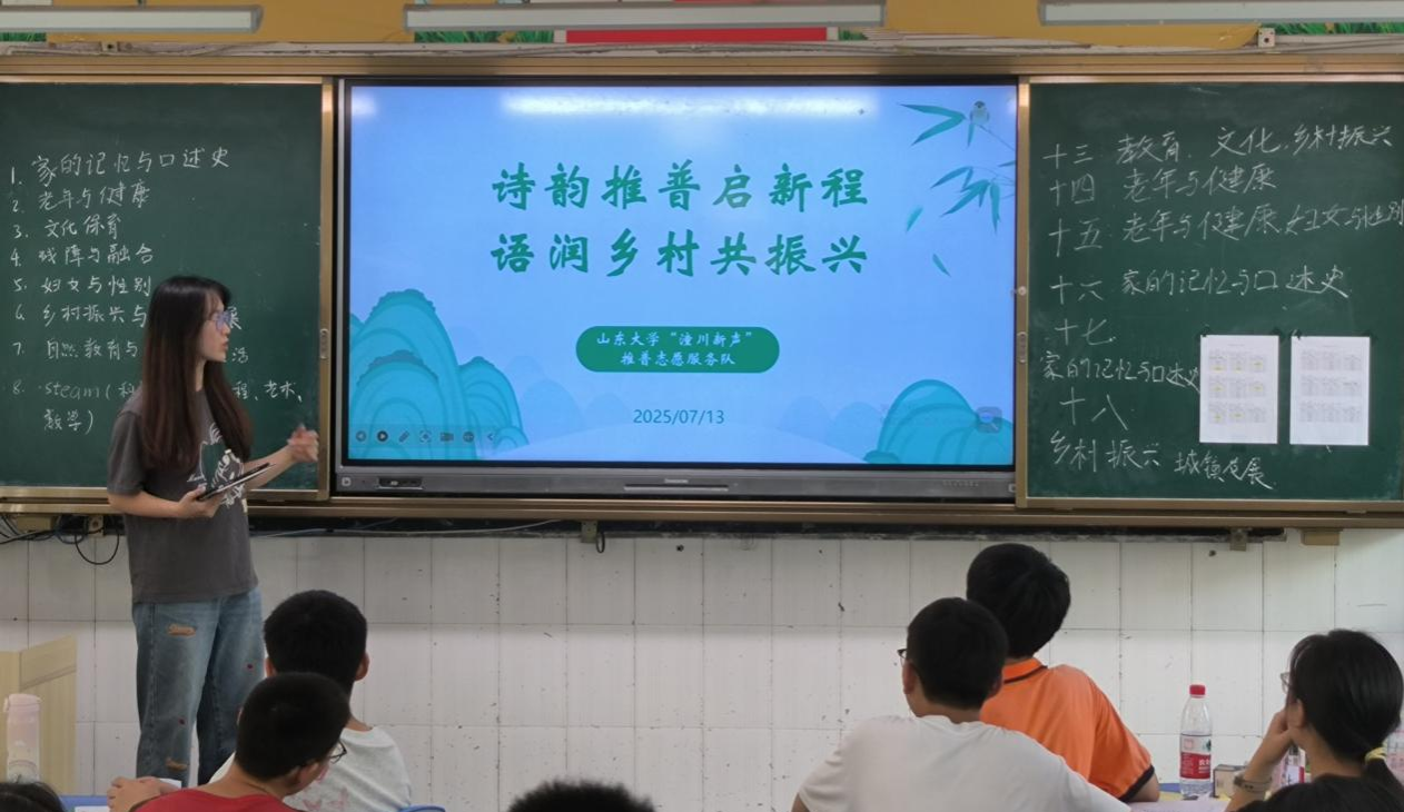 7月11日至15日,山东大学“潼川新声”推普志愿服务队在四川省绵阳市三台县新生镇开展普通话推广活动,通过调研走访、课堂教学、实践互动等形式,助力普通话推广与乡村文化振兴。