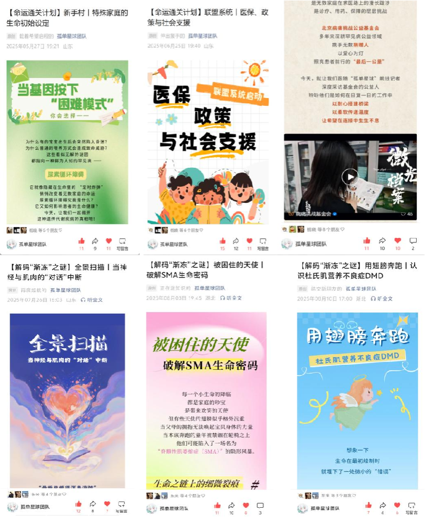 团队围绕尿素循环障碍、神经肌肉疾病等罕见病病种,策划制作了一系列兼具科学性与可读性的科普产品。同时,团队聚焦公益人故事、项目透明度等议题,推出宣传视频“微光档案”,通过平实的语言表达与可视化叙事,提升内容的传播力与接受度,相关作品已在团队公众号、病痛挑战基金会、尿素循环障碍之家官方平台发布,形成了专业知识与人文关怀相结合的传播矩阵,推动罕见病科普从单向知识传递向双向情感共鸣转化。
