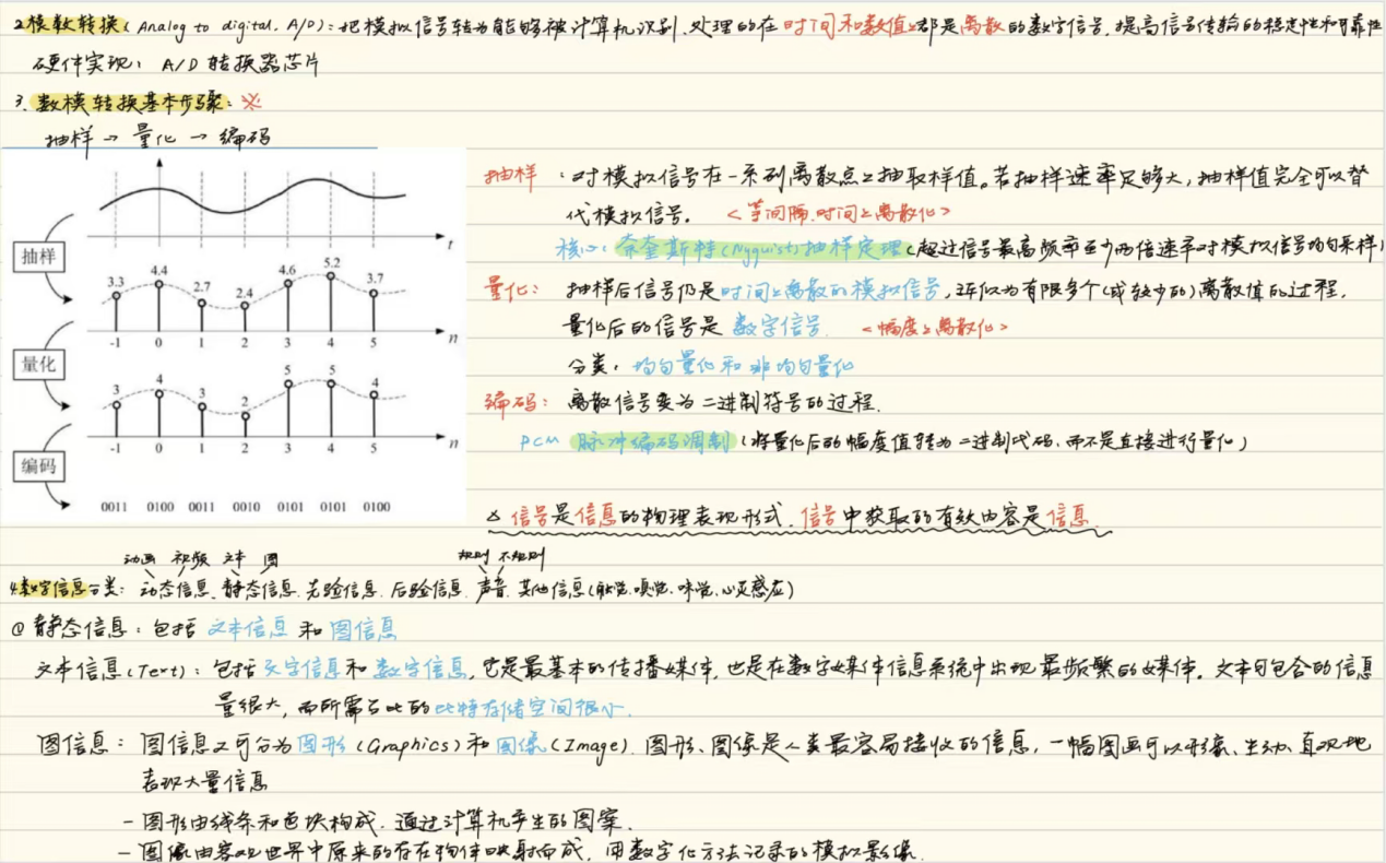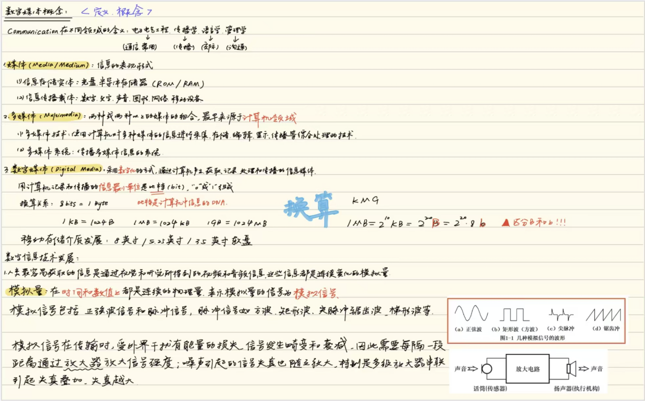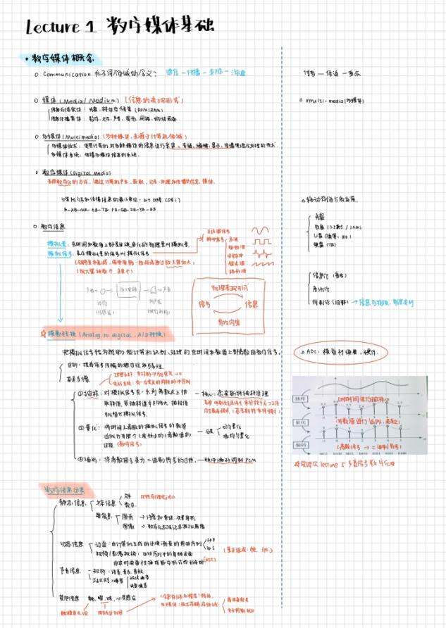 陈苗同学整理的数字媒体相关课程的课堂笔记整体围绕着数字媒体基础、网络基础以及数字音频与视频展开。笔记可视化强,配以大量手绘示意图把抽象技术原理直观呈现,用不同颜色的笔和方框、圆圈标注核心内容,补充延伸内容让知识更完整。