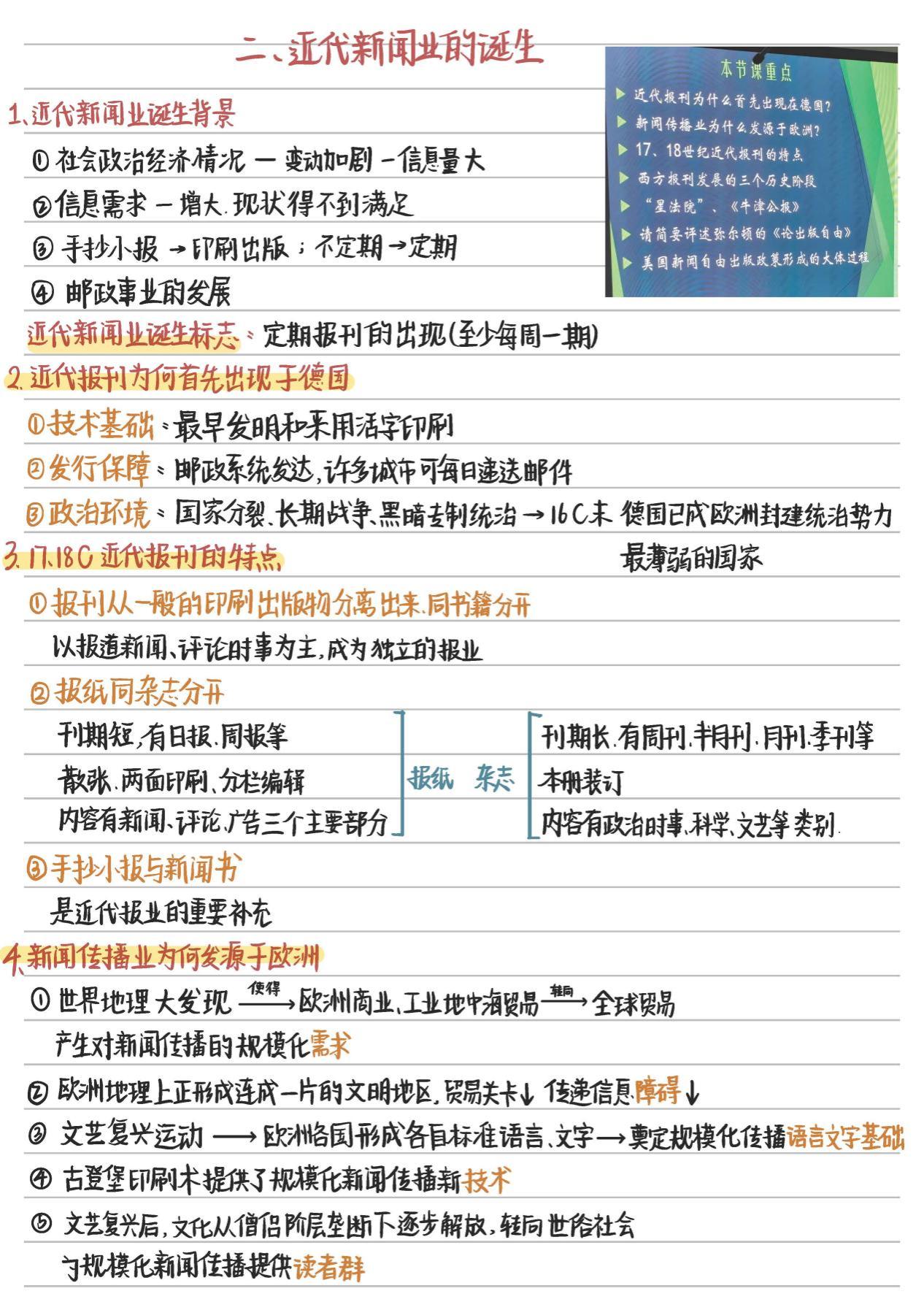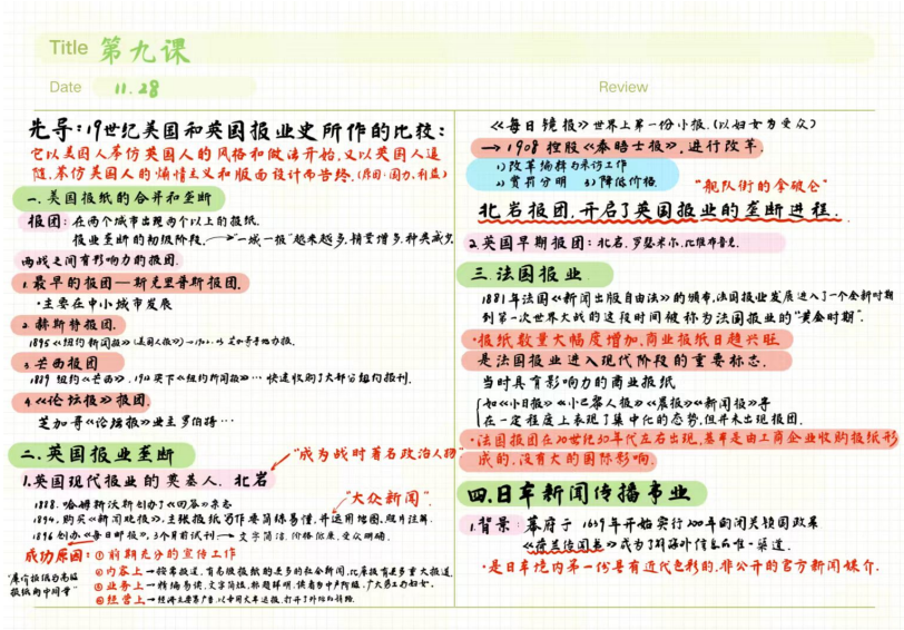 赵若苓的笔记通过不同颜色的字体强调突出重难点,在文字周围适当留白,排版视觉效果美观。笔记以独立报刊的出现和近代新闻事业的诞生为主要内容,以“总—分”结构展开,在笔记开头标注课堂重点,方便于后期复习和记忆。