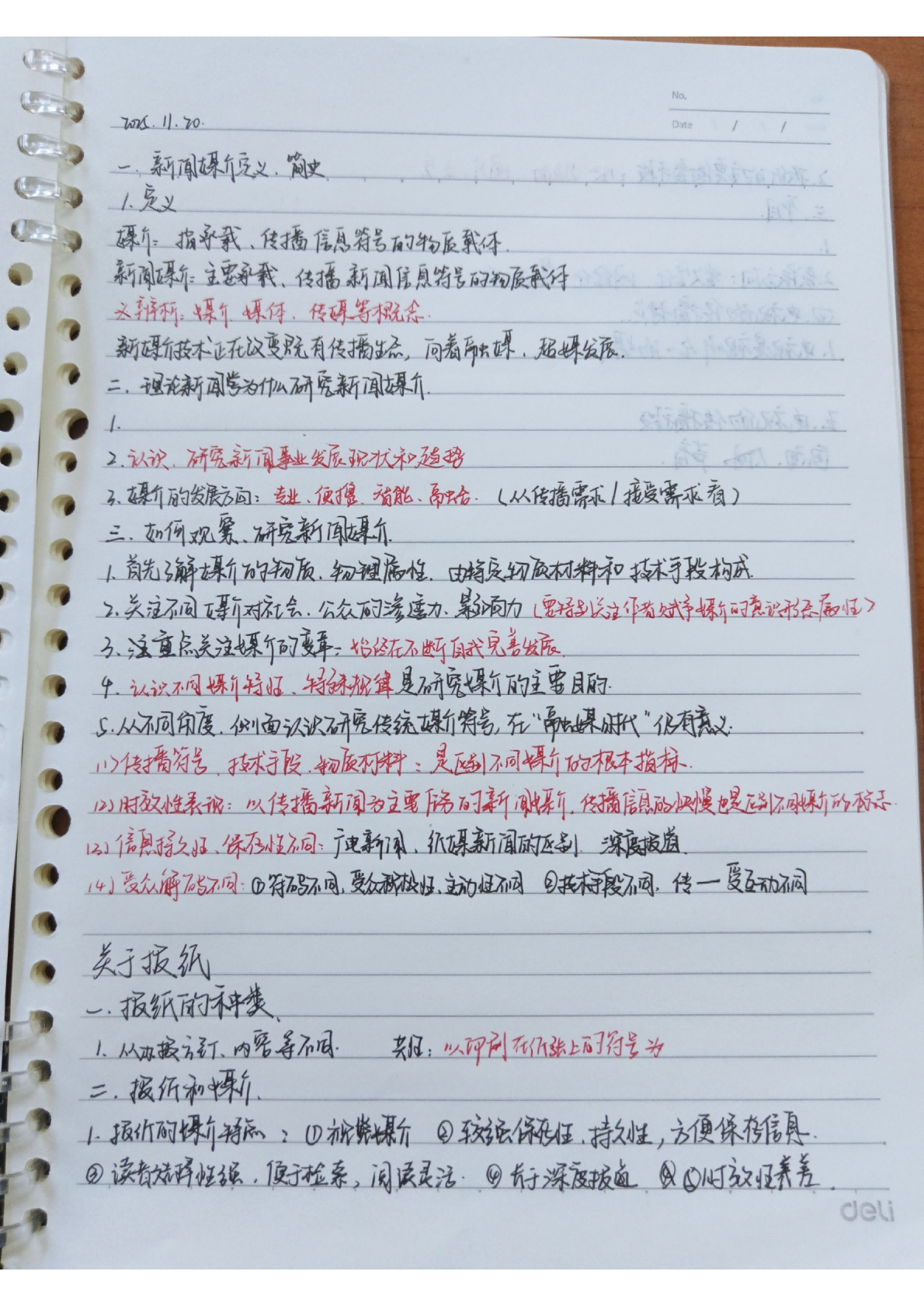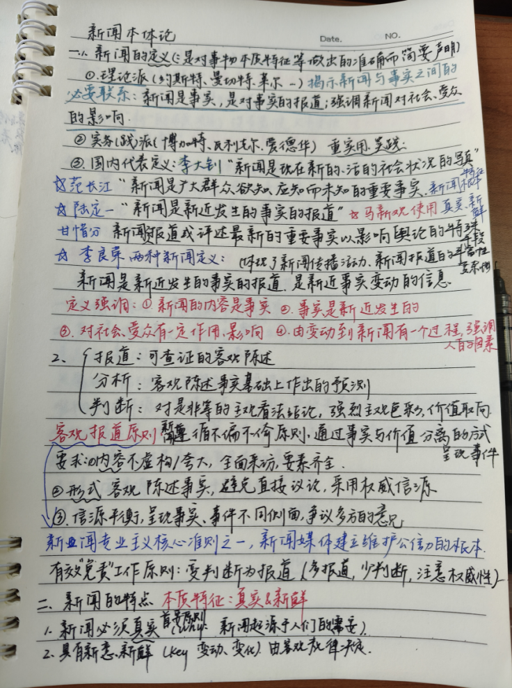 陈诗棋的笔记以唯物新闻观为主线,系统梳理了新闻起源论、传播类型及新闻本体论等核心知识,构建了完整的课程框架。对于课件中难以及时记录的部分,采用“拍照+插入图片”的方式的方式进行处理,使得笔记既能实时跟进课堂节奏,又避免了因匆忙抄录而可能产生的信息遗漏或失真。