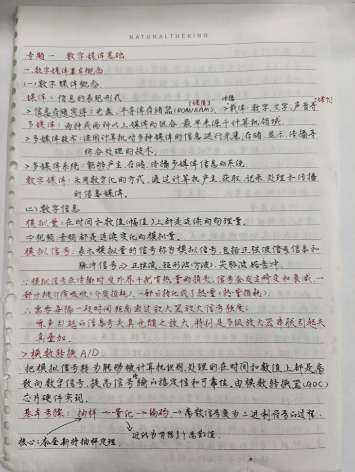刘宸宇同学的笔记内容详实、条理清晰。笔记中涵盖的历史背景、关键人物与法规节点,显示出其对新闻传播史的系统把握;而对模拟信号、A/D转换等技术要点的记录,也反映出他对数字媒体技术基础的扎实掌握。