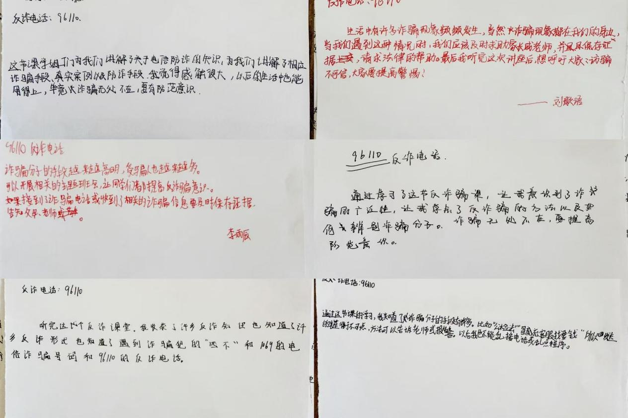 活动最后,孩子接过成员分发的白纸,纷纷提笔写下自己的所学收获和反诈呼吁。无论是“我觉得收获很大,在生活中一定会提防诈骗”的质朴感悟,还是“陌生链接不可信,大家要提高警惕”的热切倡议,都是孩子们反诈意识觉醒的直观见证,更是筑牢校园安全防线的生动体现。