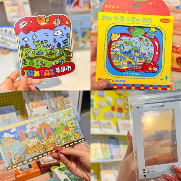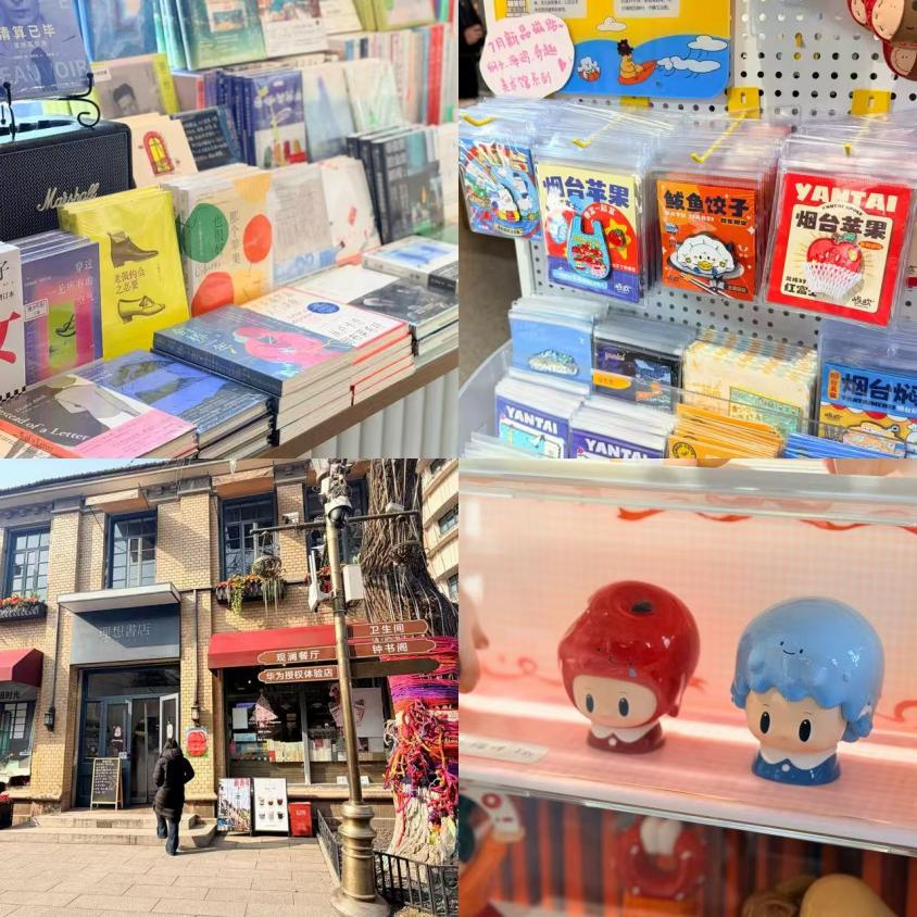 活动首站,队员们走进朝阳街内的“理想书店”。这里不仅是书香弥漫的文化空间,更成为展示烟台苹果文化创意的重要窗口。店内陈列着以苹果为主题的文创产品、地方文史书籍与艺术手作,将城市记忆与当代生活美学融入一颗苹果的故事中。队员们通过访谈店员、观察读者互动,深切感受到农产品品牌通过文化赋能,实现了从“物质消费”到“情感联结”的跨越,也为区域品牌叙事提供了鲜活载体。