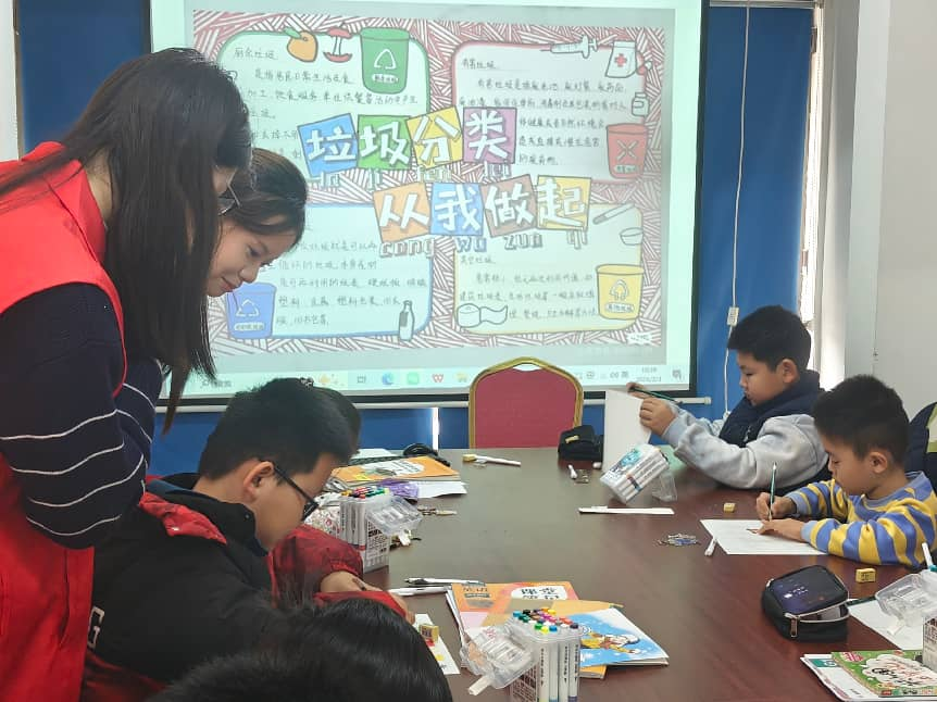 第二节课为垃圾分类主题手抄报创作。支教队员通过图文讲解、案例展示,向孩子们普及垃圾分类知识与环保理念,引导大家树立绿色生活意识。在队员们的耐心指导下,孩子们充分发挥想象力与创造力,用画笔与文字勾勒出一幅幅主题鲜明、色彩丰富的手抄报,在动手实践中加深对垃圾分类的理解,将环保理念内化于心、外化于行。