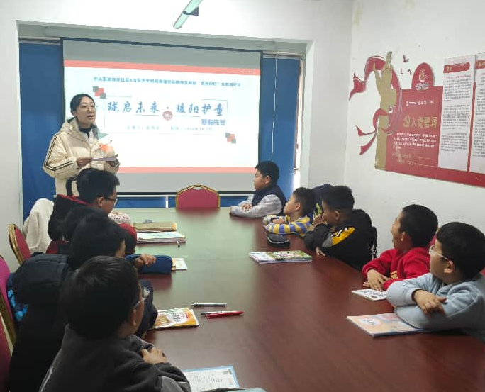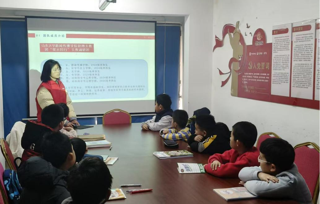 2月3日,山东大学新闻传播学院助翔支教团“萤光同行”支教调研团走进山东省济南市华山街道珑岸社区,在社区居委会搭建的寒假社区公益托管临时教室举行开营仪式,标志着为期一周的寒假支教志愿服务正式启动。本次活动聚焦社区儿童假期看护与素质教育需求,以公益陪伴形式助力儿童友好型社区建设,同时为青年学子搭建实践育人、服务社会的成长平台。