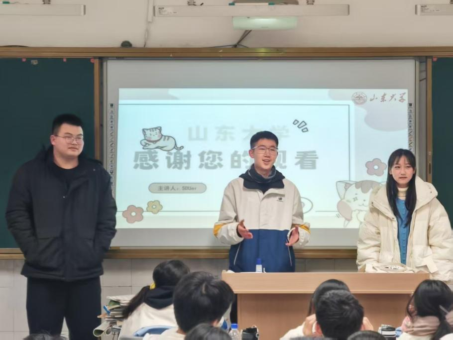 随后,卢科贝从校园生活、学习经验与专业体验三个切口切入,结合PPT进行讲解。“山大式的爱,说不尽,讲不完”,她生动分享了山大的暖心福利:图书馆报销购书费用、大师讲座定期开讲、食堂定制家乡菜,以及贴心的“i山大”软件等等。通过了解真实的校园体验分享,同学们对山大的生活充满了向往。