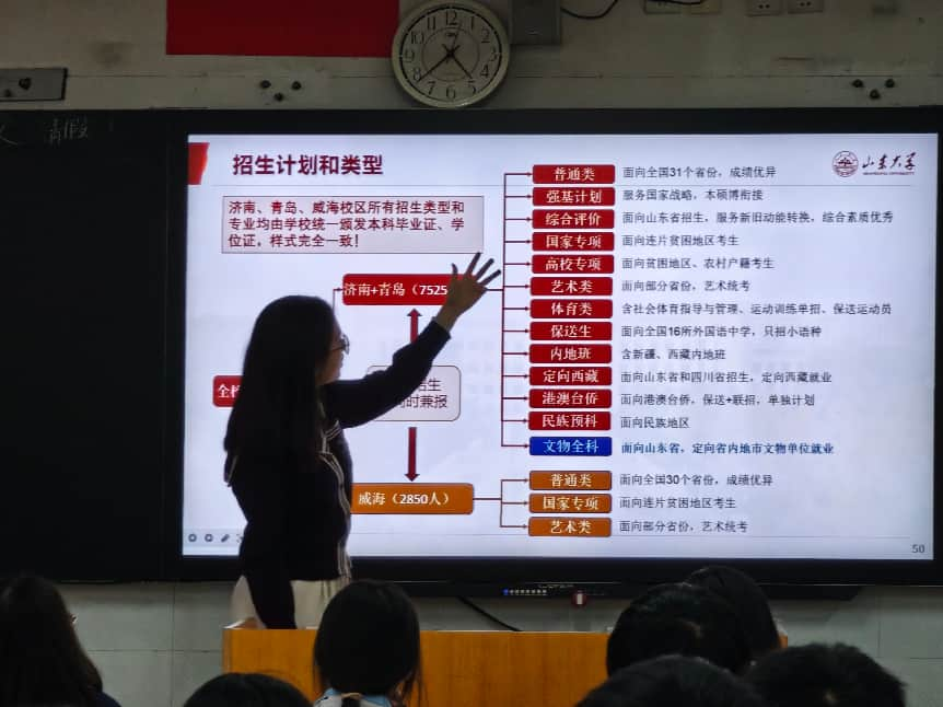 寇晓炜同学再次登台,围绕“一体招生,多元录取”主题,结合2025—2026年本科招生政策,为学弟学妹们系统解读了山东大学的招生类型与录取规则。招生计划涵盖强基计划、综合评价、艺术类、体育类、定向西藏、港澳台侨、民族预科、文物全科等多种类型,面向全国31个省份招生。她还特别提到文物全科人才定向培养等特色项目,让同学们对多元化的升学路径有了更清晰的认识。