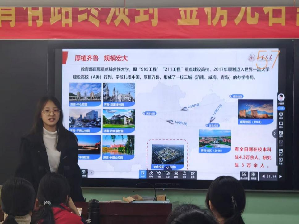宣讲伊始,队员们首先展示了自行制作的宣传物料,并播放了宣传先导片,激起高三学子们对于山大的浓厚兴趣。闫紫璇同学详细准确地介绍了山东大学的历史与优势,展现了山大过去的深厚底蕴与优良传统、当代的宏大规模和雄厚实力。随后又对山大的教学与资源进行介绍,让同学们对山大的基本情况、培养模式、师资力量、资助与奖励政策有一定的了解,全方位展现出山大的优势,吸引同学们报考山大。
