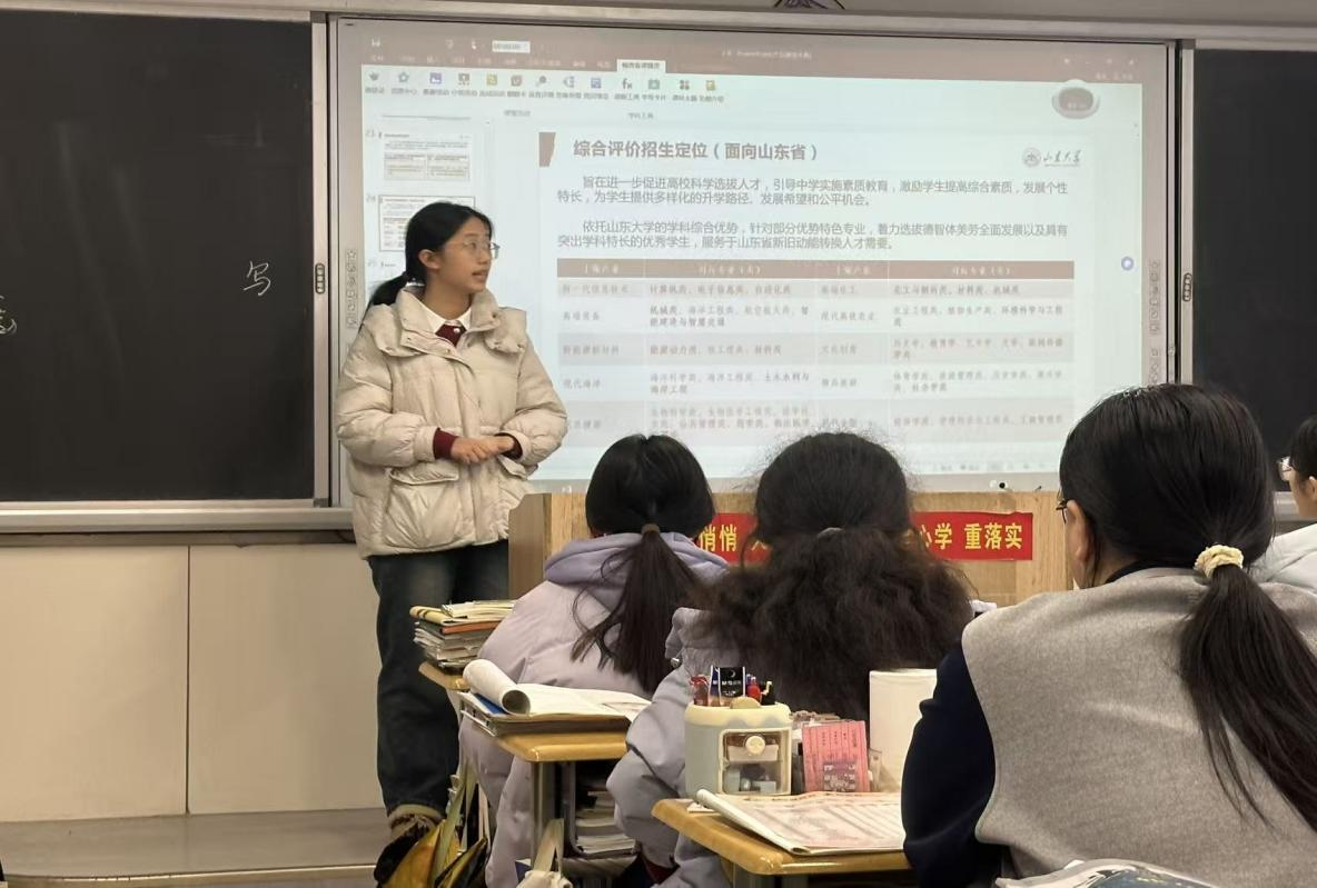 基于前期的充分准备,2月26日下午,薛雅蕾作为主讲人,面向高三二班学生展开了一场内容丰富的主题宣讲。本次宣讲以“相约山大·励志启航”为主题,从校史底蕴、一校三地办学格局、优势学科、校园生活、人才培养与招生政策等多个层面,全面展现山东大学的独特魅力与深厚实力。从百廿学府的文脉传承,到文史哲、数理化、临床医学等一流学科的蓬勃发展;从泰山学堂、尼山学堂、齐鲁医学堂等拔尖创新人才培养平台,到完善多元的奖助体系与丰富向上的校园文化,宣讲成员用鲜活的校园故事与真实的成长经历,将山大的学术高度、人文温度与发展广度一一呈现,让在场学子真切感受到百年学府的气度与担当,在心中种下奔赴理想、逐梦山大的种子。