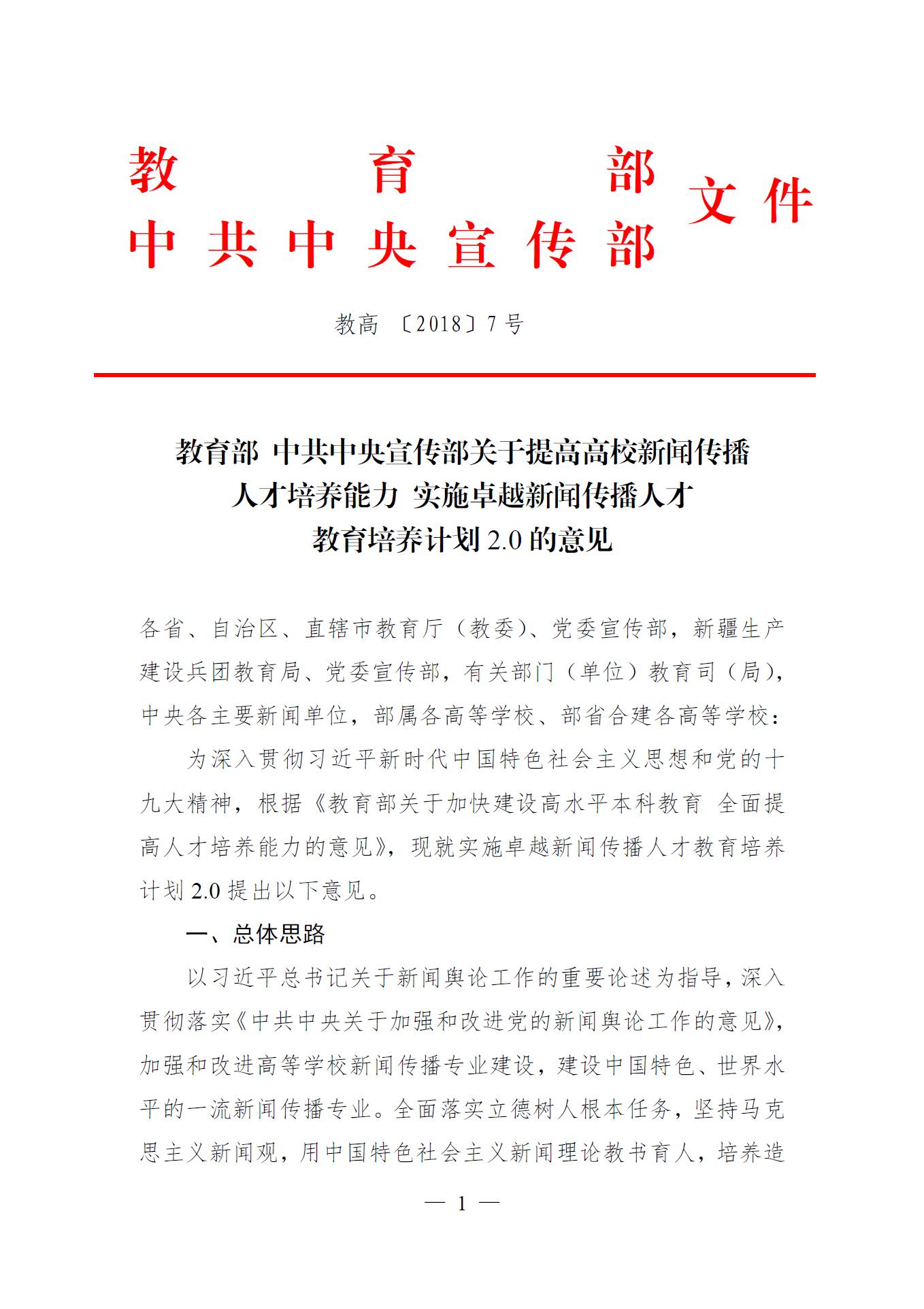 教育部关于提高高校新闻传播人才培养能力 实施卓越新闻传播人才教育培养计划2.0 的意见