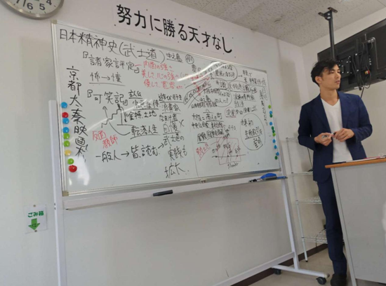 2019年8月2日上午9点30分,“山川行鹤”社会实践队队员刘梦青、宫姝璇、庄瀚林来到大阪国际未来学院301教室,听阪上光老师讲解“日本精神史”。