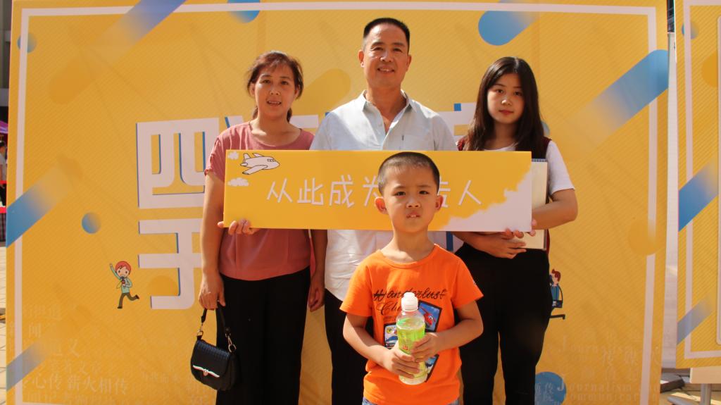 (新生与家人在主题板拍照留念)