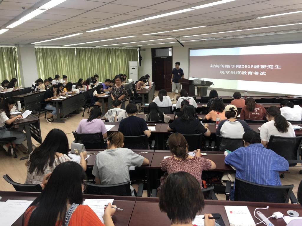 9月6日下午,山东大学新闻传播学院组织2019级研究生于中心校区信息楼进行规章制度考核。新闻传播学院党委副书记王丽君参与考核活动。