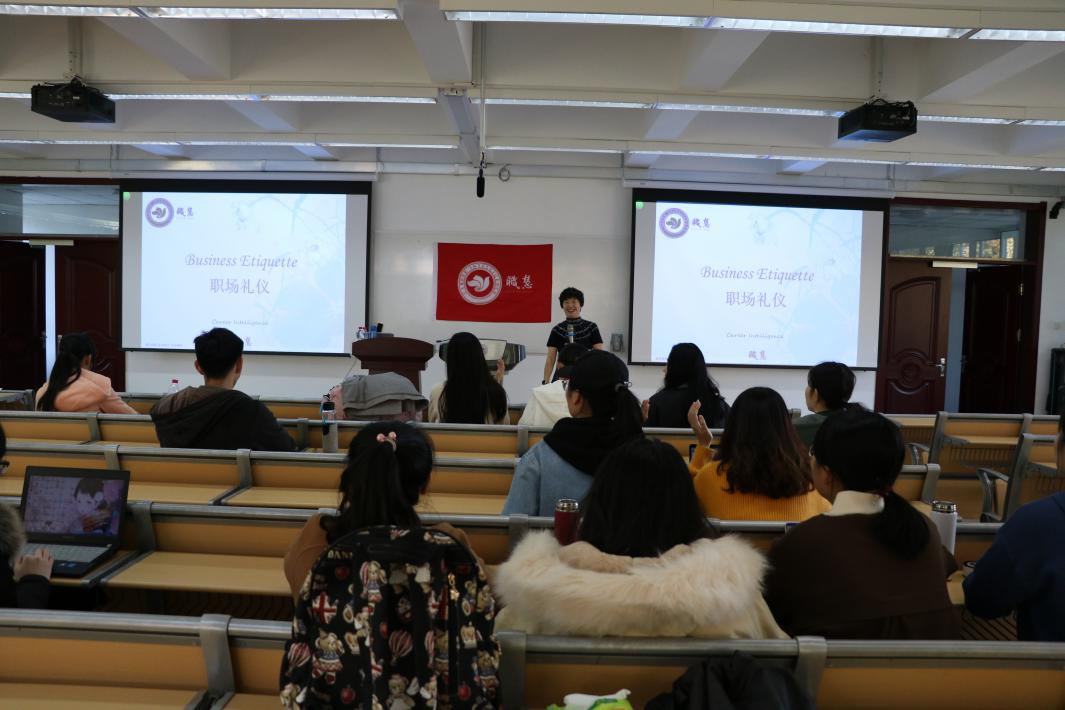 随后陈秋颖着重介绍了职场着装、职场用餐、手机/微信的使用、出行礼仪等方面的问题,列举了同学们在生活和工作中会遇到的一些情形,正面和反面案例相结合,非常生动丰富。此外,她还讲到中外交往的问题,分享了几个有趣的视频,让大家重视礼仪,学习礼仪。