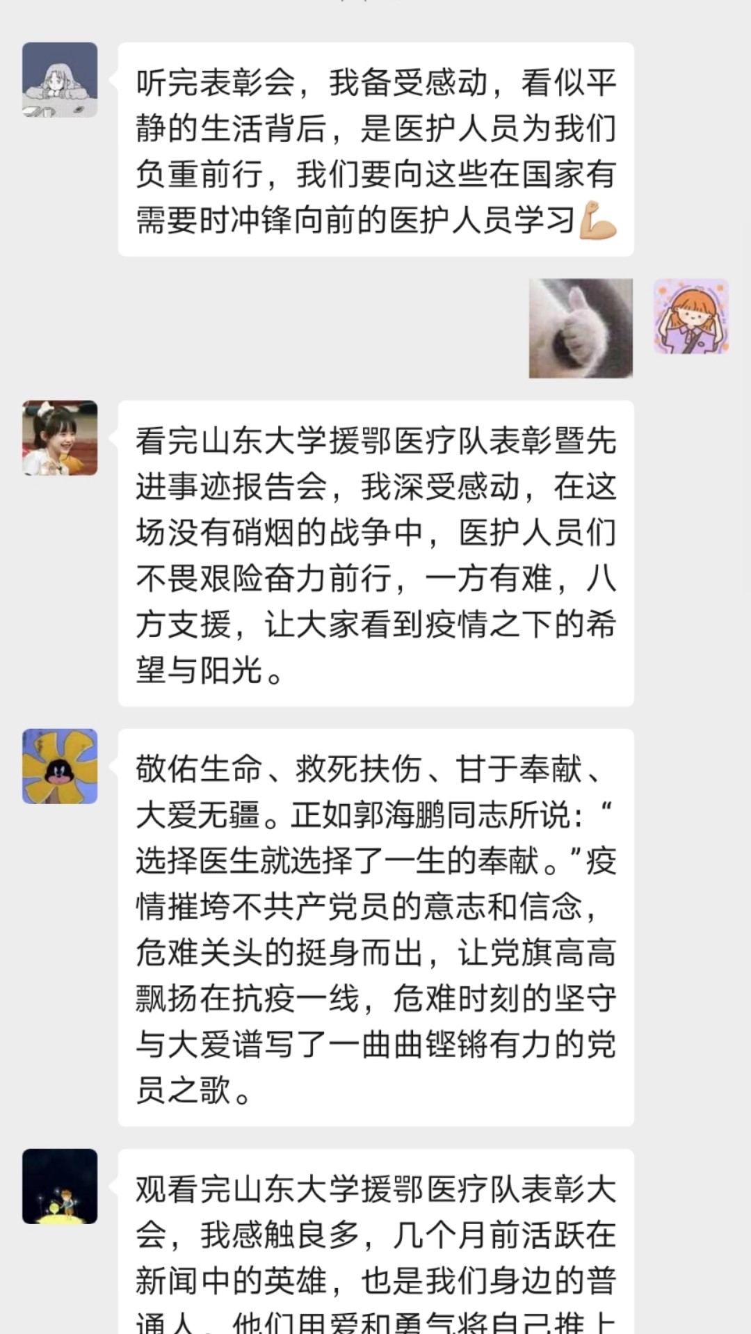 聆听过后,同学们对这场山东大学援鄂医疗队表彰暨先进事迹报告会深有感触,纷纷发表感想。刘晨曦同学谈到:“看完山东大学援鄂医疗队表彰暨先进事迹报告会,我深受感动,在这场没有硝烟的战争中,医护人员们不畏艰险奋力前行,一方有难,八方支援,让大家看到疫情之下的希望与阳光。”