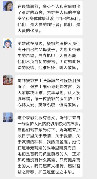 王雨同学说:“看到多位援鄂人士的平安归来,听到他们讲述的武汉援助故事,我被他们英勇无私的精神所感动。疫情期间,我们大多数人在家中只能通过新闻来了解疫情和援助情况,今天近距离聆听他们的故事,走近了他们的亲身经历,让我仿佛又回到了那段全国上下齐心协力抗击疫情的日子。抗疫工作仍在进行中,正是因为有他们这些辛苦奋战在一线的战士们,我们才能享受到安宁的学习和工作生活,衷心地感谢所有疫情工作者。”
