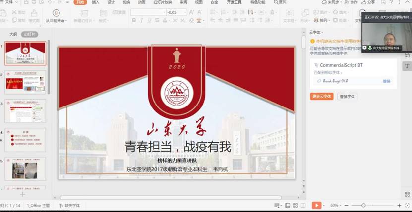 接着,荣获山东大学2019年“榜样的力量”的韦肖杭同学作了“青春有我,战疫担当”的分享。她结合自身经历,向同学们讲述了自己在抗疫期间的工作:积极参与社区防疫,利用韩语专业知识参与语言志愿服务,坚持体育锻炼以保持最好的工作状态。