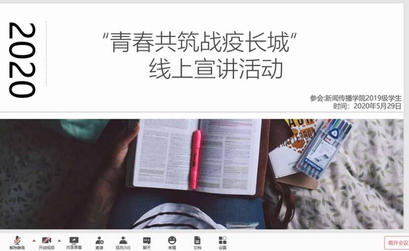 2020年5月29日晚,山东大学新闻传播学院举办了“青春共筑战疫长城”暨“榜样的力量”就业成长宣讲活动。本次活动邀请了亲赴抗疫一线的山东大学第二医院医疗队呼吸内科副主任王永彬医生和荣获山东大学2019年“榜样的力量”十大人物的韦肖杭同学,他们就本次活动主题向2019级本科生进行了宣讲。