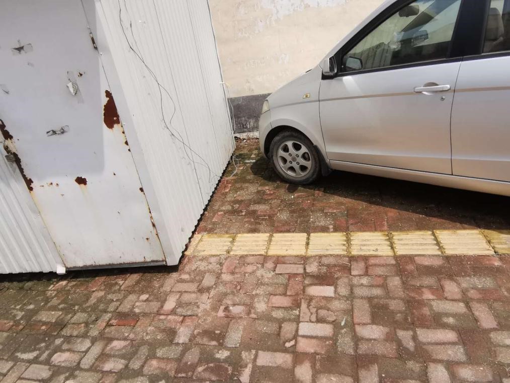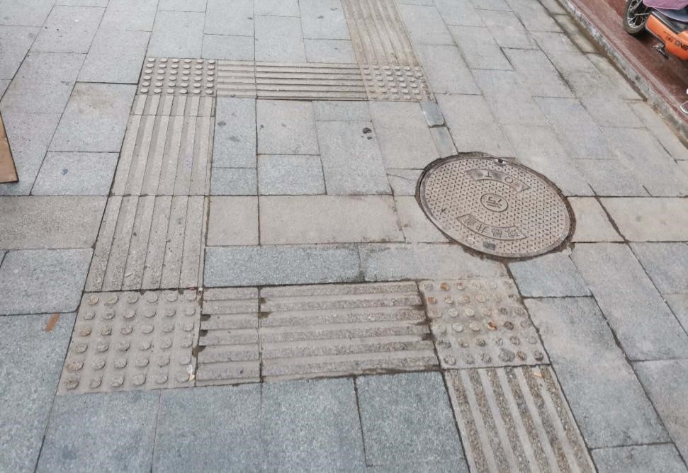 中心街是沂水县的中心商业地,人群车辆同样是非常密集。盲道存在的问题有设置混乱,乱停乱放和受损问题。但是在井盖问题上,其盲道实现了跨度较大的绕道,这点是比较好的情况,且在拐点处的砖体用了不同的花纹(带有圆点的提示砖)可以让盲人更好地感知方向。