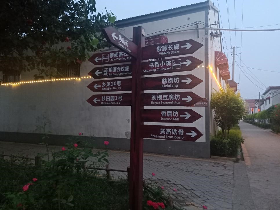 走进粮画小镇,首先映入眼帘的就是青瓦白墙的农舍,街道整洁、巷陌井然、优雅清静,间隔摆放的石碾、石磨、古井和老房旧址增添了复古的气息,村庄主路两旁错落着的咖啡屋、粮画作坊、善禾小剧场、冀南名吃街又赋予了村庄时尚品味,传统与现代的巧妙结合,让整个粮画小镇都充盈着文化的韵味。在保持了乡村建筑原貌的基础上又增加了方便舒适、富有品味的城市时尚现代元素,是粮画小镇文化最好的体现。