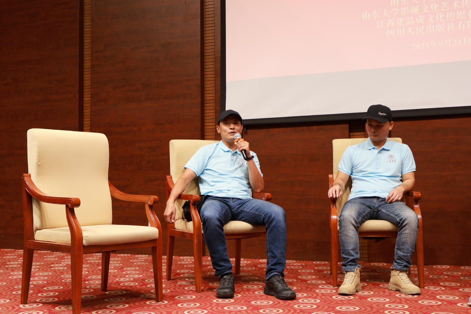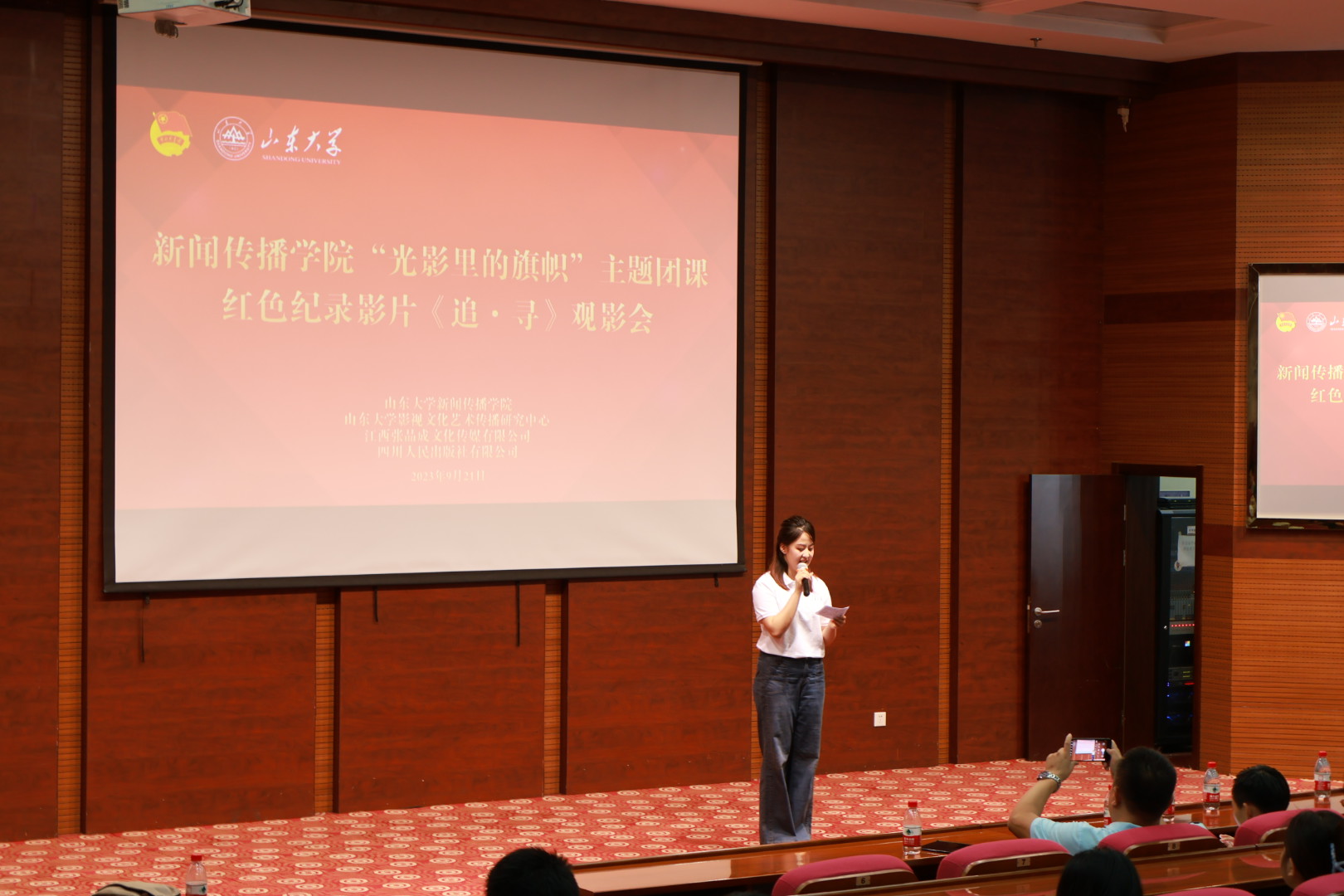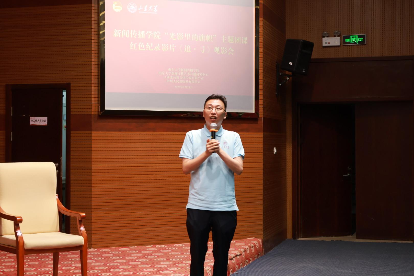 为追寻红色足迹,感悟思想伟力,凝聚逐梦中华民族伟大复兴的精神力量,推进学院主题教育走深走实,提升学院一院一品文化建设质量,9月21日下午,山东大学新闻传播学院在知新楼C座思源报告厅开展“光影里的旗帜”主题团课暨红色纪录影片《追·寻》观影活动。在学校党委宣传部的指导下,本次观影活动由山东大学新闻传播学院、山东大学影视文化艺术传播中心,联合江西张品成文化传媒有限公司、四川人民出版社有限公司共同主办,由新闻传播学院团委和学生影视文化传播服务社团承办。国家一级作家、导演及影片策划张品成、制片人魏京、副导演及制片主任赵文捷、摄影指导张严、后期剪辑及宣发助理翁崧、嘉宾张嵚与新闻传播学院团员学生共同观影,本次活动由新闻传播学院2023级硕士研究生齐广媛主持。