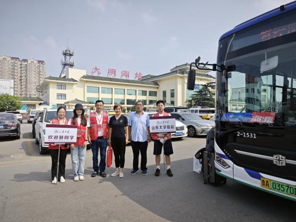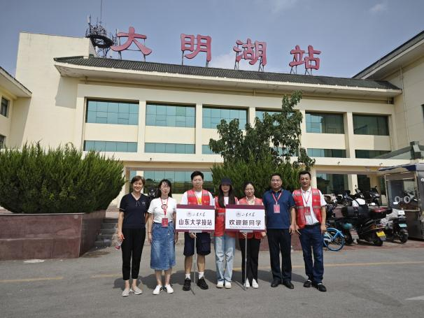 在大明湖火车站,同样也能够看到新闻传播学院志愿者们的身影,由6名研究生党员组成的服务小分队高举接站牌,护送新生与家长来到校园,“同学你好,山大欢迎你!”一句暖心的话语,一个指引的动作,“向前一步”的青年党员们以实际行动成为同学们入学路上最信任、最踏实的依靠。