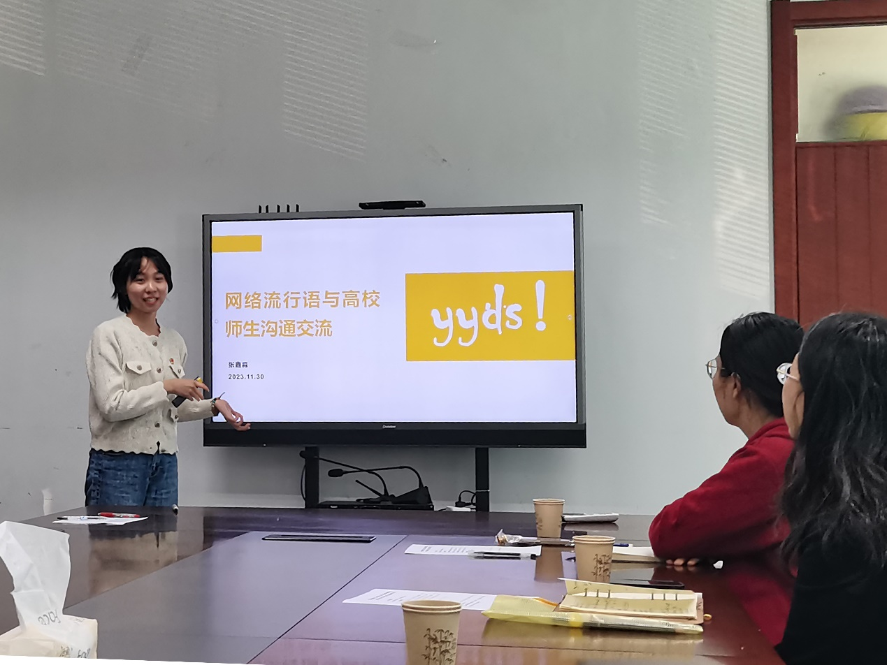 新闻传播学院2023级硕士生党支部党员代表张鑫淼,围绕《网络流行语与师生沟通交流》一题进行了分享。她细致介绍了网络流行语的发展过程、流行规律、传播特点,并结合社会现象和热点,向师生党员科普了近期流行的网络热词和延伸含义。张鑫淼结合主流媒体的经典案例,对当下师生在沟通交流中应当如何跨越媒介使用的代际差异,提出了可以将网络流行语和学生教育进行结合,进而丰富教育手段,拉近师生距离的建议。