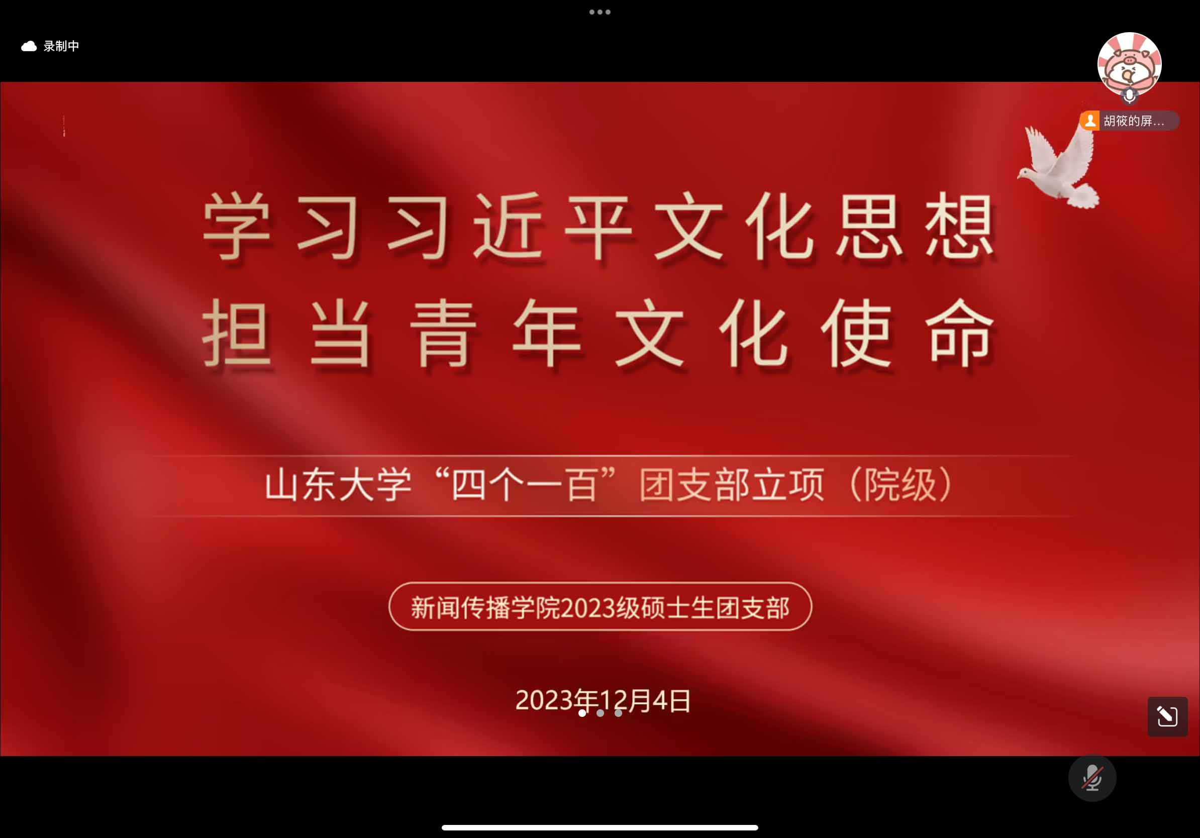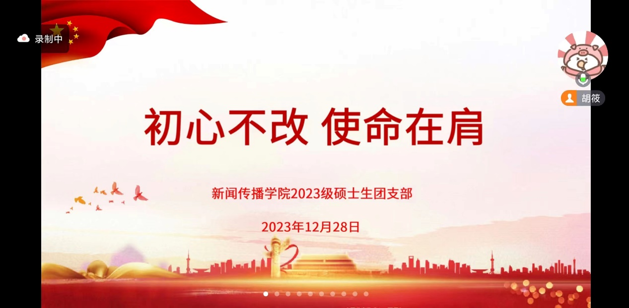 2023年12月,山东大学新闻传播学院2023级硕士生团支部分别开展了“学习习近平文化思想,担当青年文化使命”“初心不改,使命在肩”两次主题教育。两次主题教育由2023级硕士生团支部团支书胡筱主持,2023级硕士生团支部团员青年参加活动。