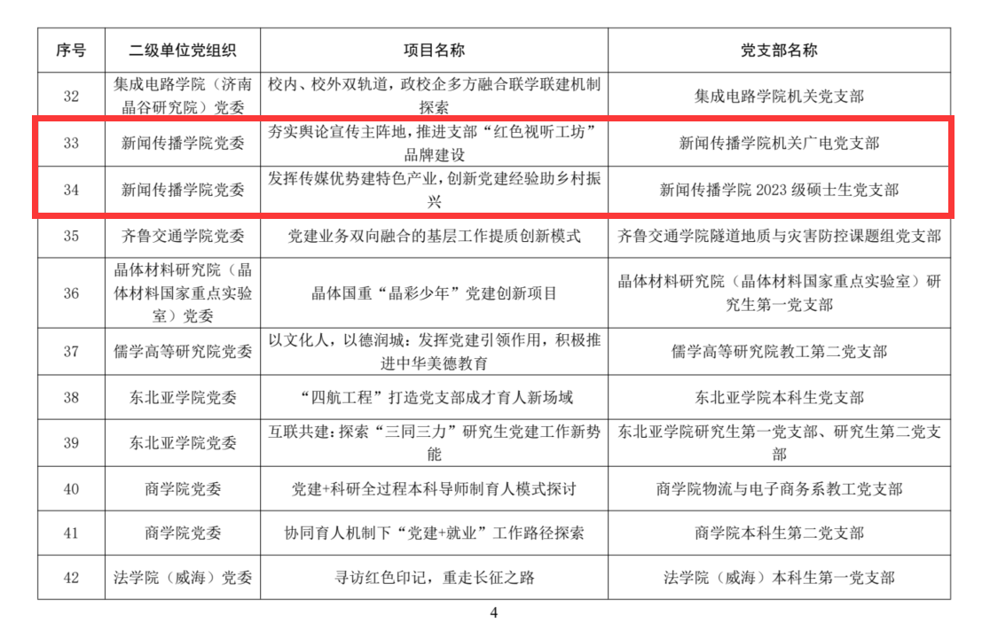 新闻传播学院党建研究立项“以‘四力’促‘四能’,探索基层学生党支部政治功能实现路径研究”项目、新闻传播学院机关广电党支部“夯实舆论宣传主阵地,推进支部‘红色视听工坊’品牌建设”项目、新闻传播学院2023级硕士生党支部“发挥传媒优势建特色产业,创新党建经验助乡村振兴”项目获批立项。