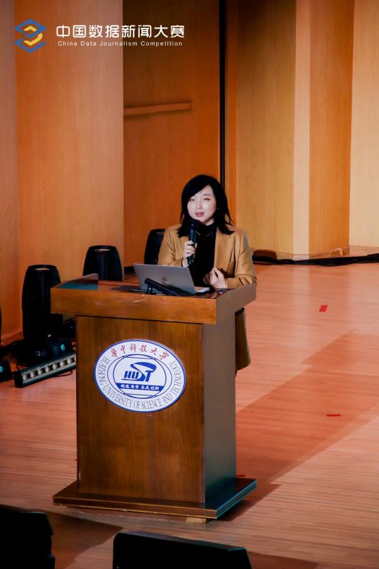 侯滢在发言中提到,山东大学新闻传播学院作为首批中宣部、教育部确立与地方宣传部共建的高校新闻院系之一,拥有新闻传播学博士硕士本科完整人才培养体系。自2016独立建制以来在新媒体、数据新闻及数智实验室建设方面取得显著成果。学院2017年首开《数据新闻及可视化》课程,每年产出优良学生作品刊登于省内各大媒体或在相关比赛中获得奖项;她代表学院感谢大赛组委会及主办方并邀请大家来山东大学及新闻传播学院进行考察与交流。