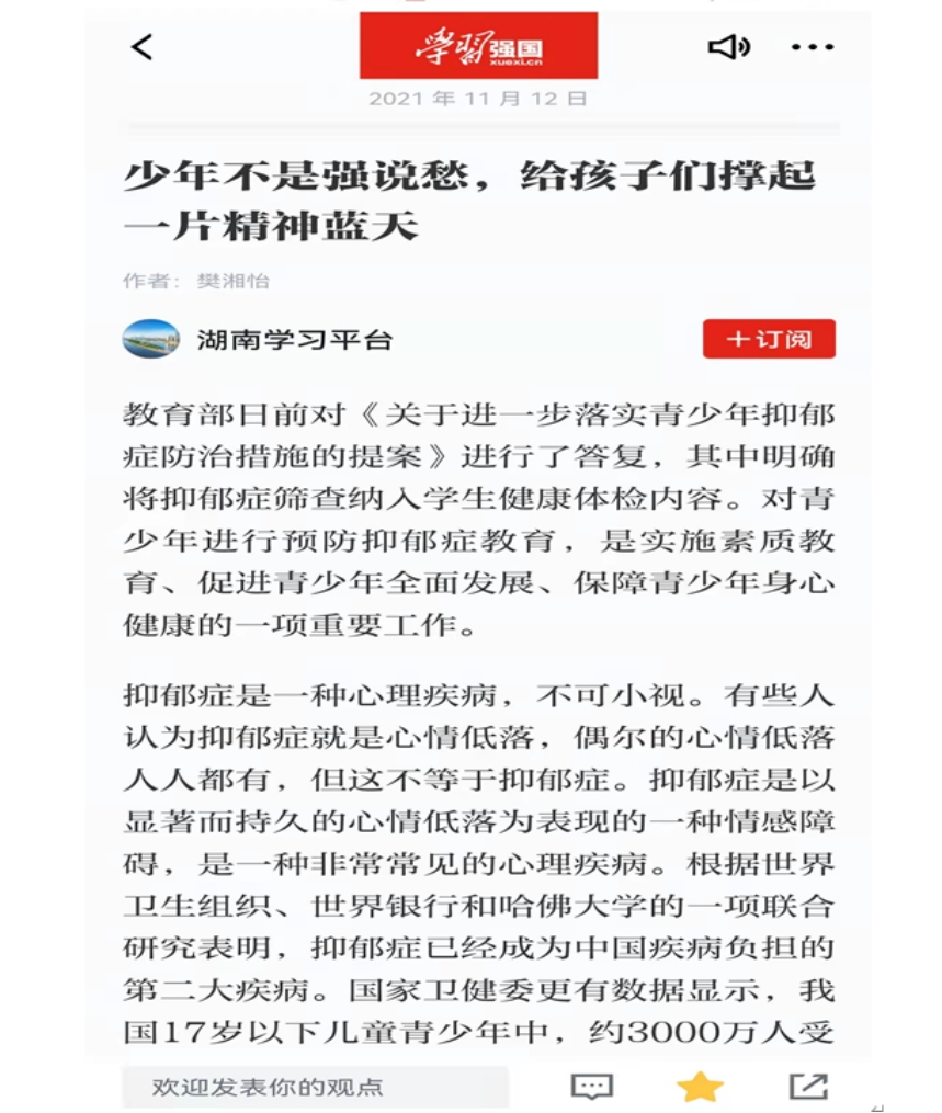 《少年不是强说愁,给孩子撑起一片精神蓝天》立足于我国青少年抑郁症高发的社会现实,结合心理学专业知识,分析当下青少年抑郁症发病的原因和机理,表达了“少年不是强说愁”的中心观点,强调宽容理解的环境是治疗抑郁症的核心所在,呼吁全社会关心未成年人心理健康,给他们撑起一片精神蓝天。这篇评论在红网阅读量达3.5万,获得学习强国全国平台“青春中国”的重点推荐。