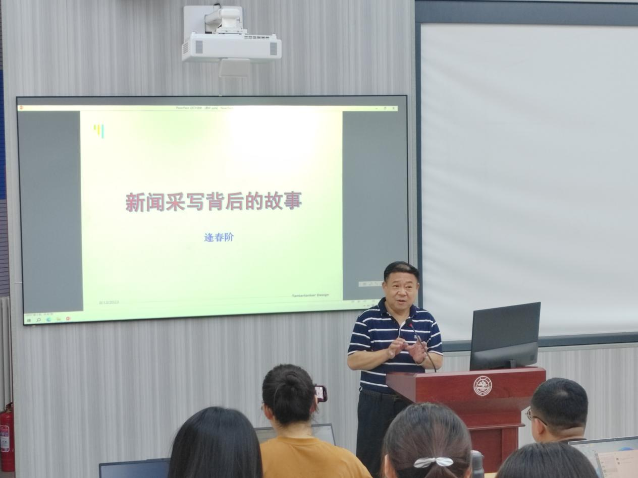 2023年9月13日,新闻传播学院2023年秋季学期“业界精英进课堂之我所经历的新闻故事”系列课程第一讲在中心校区董明珠楼113d教室举行。本讲由大众报业集团高级记者、全国优秀新闻工作者、山东省报告文学会长逄春阶担任主讲人。