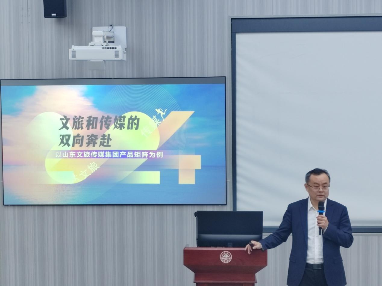 本次课程的分享主题为:“文旅与传媒的双向奔赴——以山东文旅传媒集团的产品矩阵为例”。课程伊始,庞道锋从“双向奔赴”与“文旅”的概念入手,给同学们举了生活化又深入浅出的例子。他认为,看起来比较宏大的“文旅”概念,实际上在生活中随处可见:说走就走的旅行,山大小树林游览活动等,实际上都暗含着“文旅”的底层逻辑。