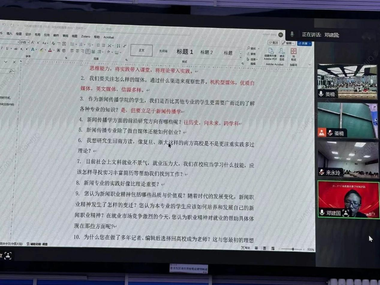 邓老师指出,作为新传学生,在信息爆炸的时代,获得信息易,判断信息难,我们要具备过滤信息、评价信息的能力。他认为大学学习如海中行舟,要自己决定方向和速度,这使得自我管理能力尤其重要。他还指出新闻是一个追逐潮流的学科,同学们在学习专业理论之余也要抽出时间观察新闻,理论实践两手抓,不要将考试与生活观察对立起来,而要立足于新闻实践去广泛地了解知识。邓老师特别强调,新闻人应该始终具有较强的职业精神和过硬的职业素养,不要因为新闻的娱乐化趋势和市场竞争局面的日益严峻与自己应有的职业能力和素养背道而驰。