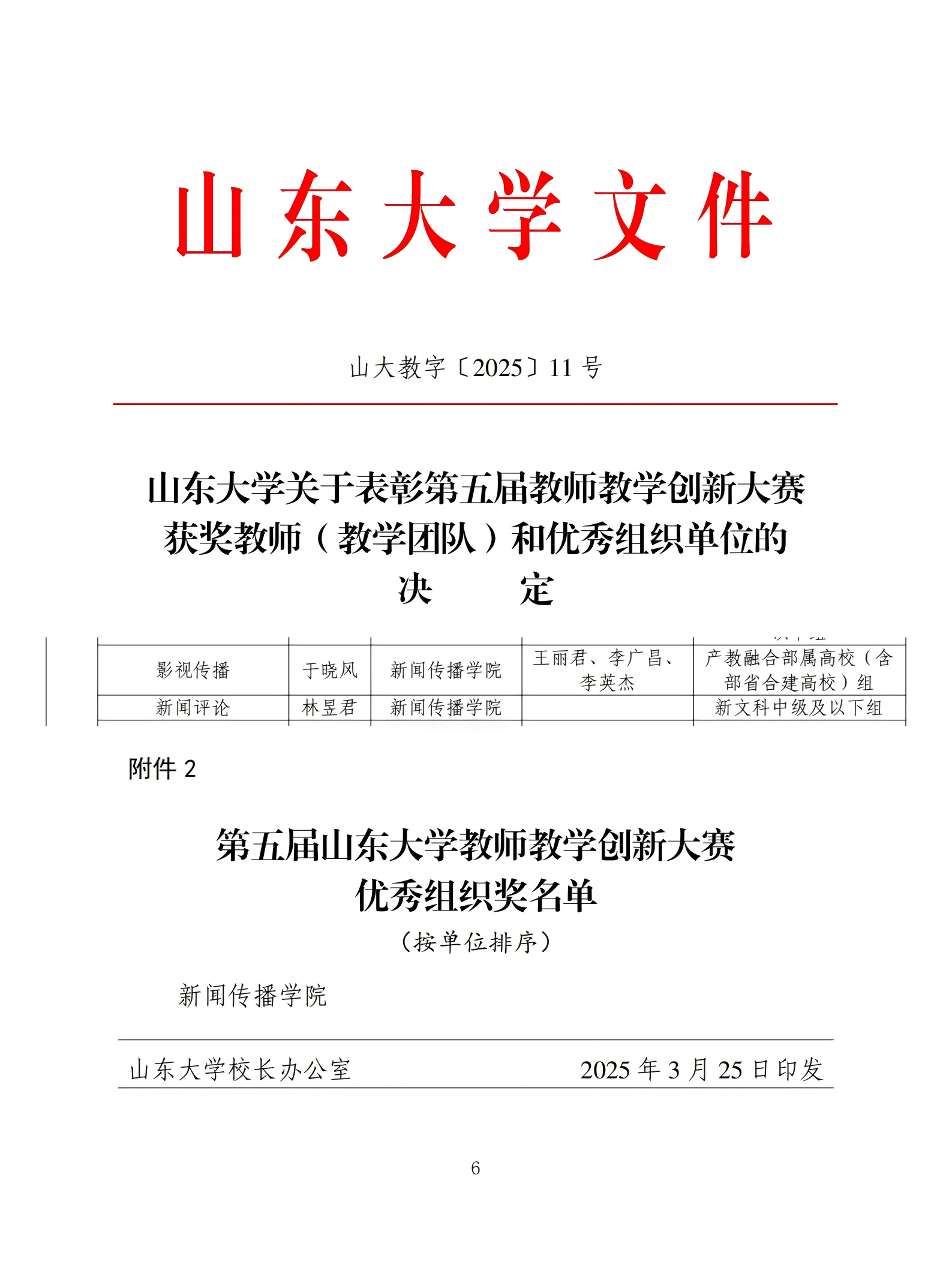 为落实立德树人根本任务,助力学校课程思政建设和新工科、新医科、新文科建设,推动信息技术与教育教学深度融合,山东大学于近日正式发布《关于表彰第五届教师教学创新大赛获奖教师(教学团队)和优秀组织单位的决定》。新闻传播学院于晓风副教授荣获产教融合部属高校(含部省合建高校)组一等奖、林昱君副教授荣获新文科中级及以下组三等奖,新闻传播学院荣获第五届山东大学教师教学创新大赛优秀组织奖。