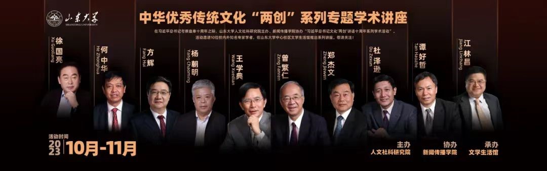 为全面学习贯彻全国宣传思想文化工作会议精神,深入研究阐释习近平文化思想,在习近平总书记视察曲阜十周年、山东大学校庆之际,人文社科研究院聚焦中华优秀传统文化“两创”,组织实施“习近平总书记文化‘两创’讲话十周年系列学术讲座”。讲座围绕优秀传统文化“两创”、“第二个结合”,邀请了来自山东大学文学院、马克思主义学院、历史文化学院、儒学高等研究院、哲学与社会发展学院,包括曾繁仁、王学典、杨朝明、郑杰文、方辉、杜泽逊、谭好哲、徐国亮、江林昌、何中华10位校内知名专家学者在中心校区文学生活馆开讲。自10月13日首场开始,至11月18日最后一场结束,讲座历时6周,采取线上线下相结合的形式,约1200人现场聆听,逾3000人线上进行收听收看。