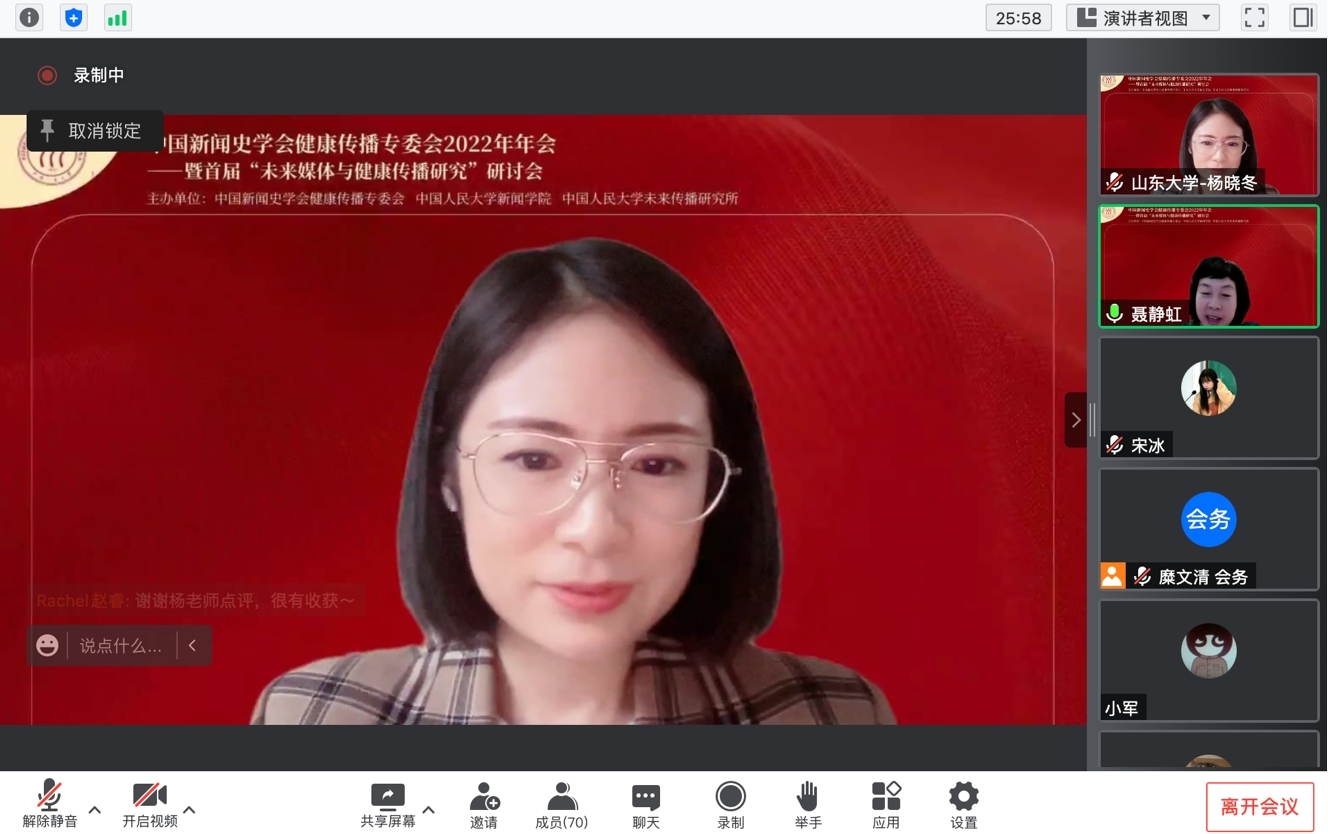 11月12日,由中国新闻史学会健康传播专业委员会主办、中国人民大学新闻学院、中国人民大学未来传播研究所联合承办的2022年中国新闻史学会健康传播专业委员会年会暨首届“未来媒体与健康传播研究”研讨会在线上召开。我院副院长杨晓冬及其研究团队投稿论文被会议接受并在大会进行宣读。