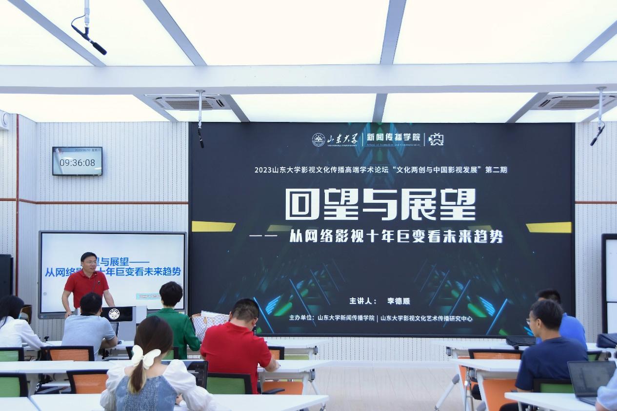 6月10日,由山东大学新闻传播学院联合山东大学影视文化艺术传播研究中心主办的2023山东大学影视文化传播高端学术论坛:“文化两创与中国影视发展”第二期在中心校区如期举行。本期讲座邀阿里巴巴大文娱上海区域总经理、优酷副总编辑李德顺作为主讲人,主题为“回望与展望——从网络影视十年巨变看未来趋势”。山东大学新闻传播学院副教授、山东大学影视文化艺术传播研究中心执行主任于晓风担任本场主持。来自山东师范大学新闻与传媒学院、山东艺术学院传媒学院、山东女子学院传媒学院、山东电影制片厂、山东影视集团、《现代视听》杂志、济南日报等单位的学界、业界和媒体来宾与我院师生共聚一堂,对技术驱动下网络影视的变革、挑战与机遇展开了深入研讨。