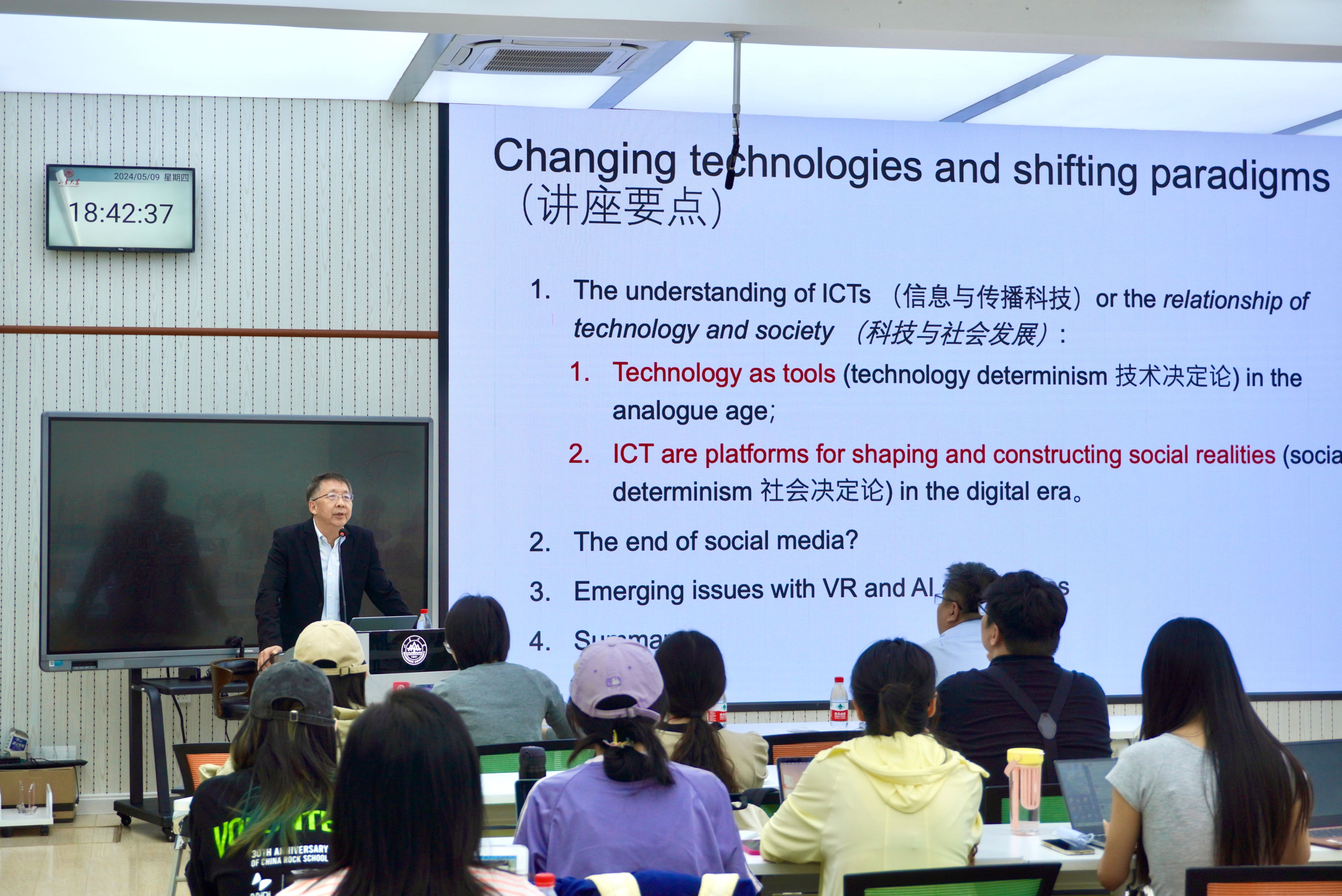 魏然教授主要围绕信息与传播科技研究范式、社交媒体的发展与问题、虚拟现实技术的发展与应用这三个主题展开分享。教授首先以科技与社会的关系为引,简单介绍了技术工具论和社会制约论,并对传播的不同内涵予以阐释。